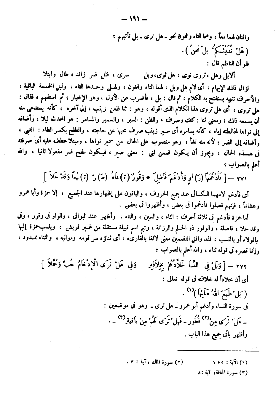 أي أن خلادا له خلاف في قوله تعالى: {بَلْ طَبَعَ اللَّهُ عَلَيْهَا} 1؛ في سورة النساء، وأدغم أبو عمرو: "هل ترى" وهو في موضعين: {هَلْ تَرَى مِنْ 2 فُطُورٍ} ، {هَلْ تَرَى لَهُمْ مِنْ بَاقِيَةٍ} 3، وأظهر باقي جميع هذا الباب.