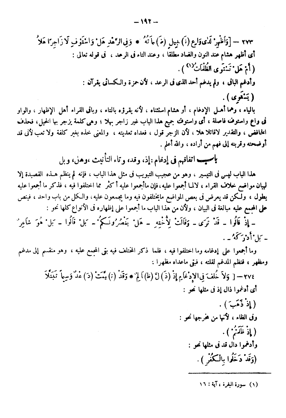 أي أظهر هشام عند النون والضاد مطلقا وعند التاء في الرعد في قوله تعالى: {أَمْ هَلْ تَسْتَوِي الظُّلُمَاتُ} 1، وأدغم الباقي ولم يدغم أحد الذي في الرعد لأن حمزة والكسائي يقرآن: "يستوي" بالياء وهما أهل الإدغام أو هشام استثناه؛ لأنه يقرؤه بالتاء وباقي القراء أهل الإظهار والواو في واعٍ واستوفِ فاصلة أي واستوف جميع هذا الباب غير زاجر بهلا وهي كلمة يزجر بها الخيل فحذف الخافض والتقدير لا قائلا هلا؛ لأن الزجر قول فعداه تعديته، والمعنى خذه بغير كلفة ولا تعب؛ لأني قد أوضحته وقربته إلى فهم من أراده والله أعلم.
