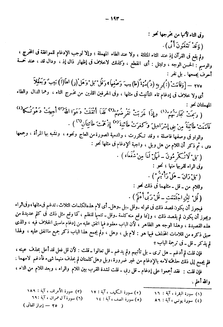 أي ولا خلاف في إدغام تاء التأنيث في مثلها وفي الحرفين اللذين من مخرج التاء وهما الدال والطاء المهملتان نحو: {رَبِحَتْ تِجَارَتُهُمْ} 1، {وَإِذَا غَرَبَتْ تَقْرِضُهُمْ} 2، {فَلَمَّا أَثْقَلَتْ دَعَوَا اللَّهَ} 3، {أُجِيبَتْ دَعْوَتُكُمَا} 4، {فَآمَنَتْ طَائِفَةٌ مِنْ بَنِي إِسْرائيلَ وَكَفَرَتْ طَائِفَةٌ} 5، {إِذْ هَمَّتْ طَائِفَتَانِ} 6.