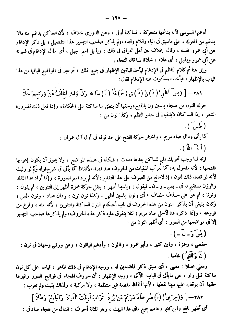 فإنه لما وجب تحريك الميم للساكن بعدها فتحت فكذا في هذه المواضع ولا يجوز أن يكون إعرابها ففتحها؛ لأنه مفعول به كما تعرب المبنيات من الحروف عند قصد الألفاظ كما يأتي في شرح قوله وكم لو وليت؛ لأنه لو قصد ذلك لنون؛ إذ لا مانع من الصرف على هذا التقدير؛ لأنه لم يرد اسم السورة وإنما أراد هذا اللفظ والوزن مستقيم له في "يس"، و"ن" فيقول: وياسينا أظهر بنقل حركة همزة أظهر إلى التنوين، ثم يقول: ونونا ثم هو على حذف مضاف أي ونون ياسين أظهر، وكذا نون "نون"، ودال "صاد"، ونون "طس"، وكان ينبغي أن يذكر النون من هذه الحروف في باب أحكام النون الساكنة والتنوين؛ لأنه منه وفرع من فروعه؛ وإنما ذكره هنا لأجل صاد مريم؛ لئلا يتفرق عليه ذكر هذه الحروف، ولم يذكرها صاحب التيسير إلا في مواضعها من السور أي أظهر النون من: "يس" و"ن" حفص وحمزة وابن كثير وأبو عمرو وقالون، وأدغم الباقون، وعن ورش وجهان في نون: {نْ وَالْقَلَمِ} خاصة.