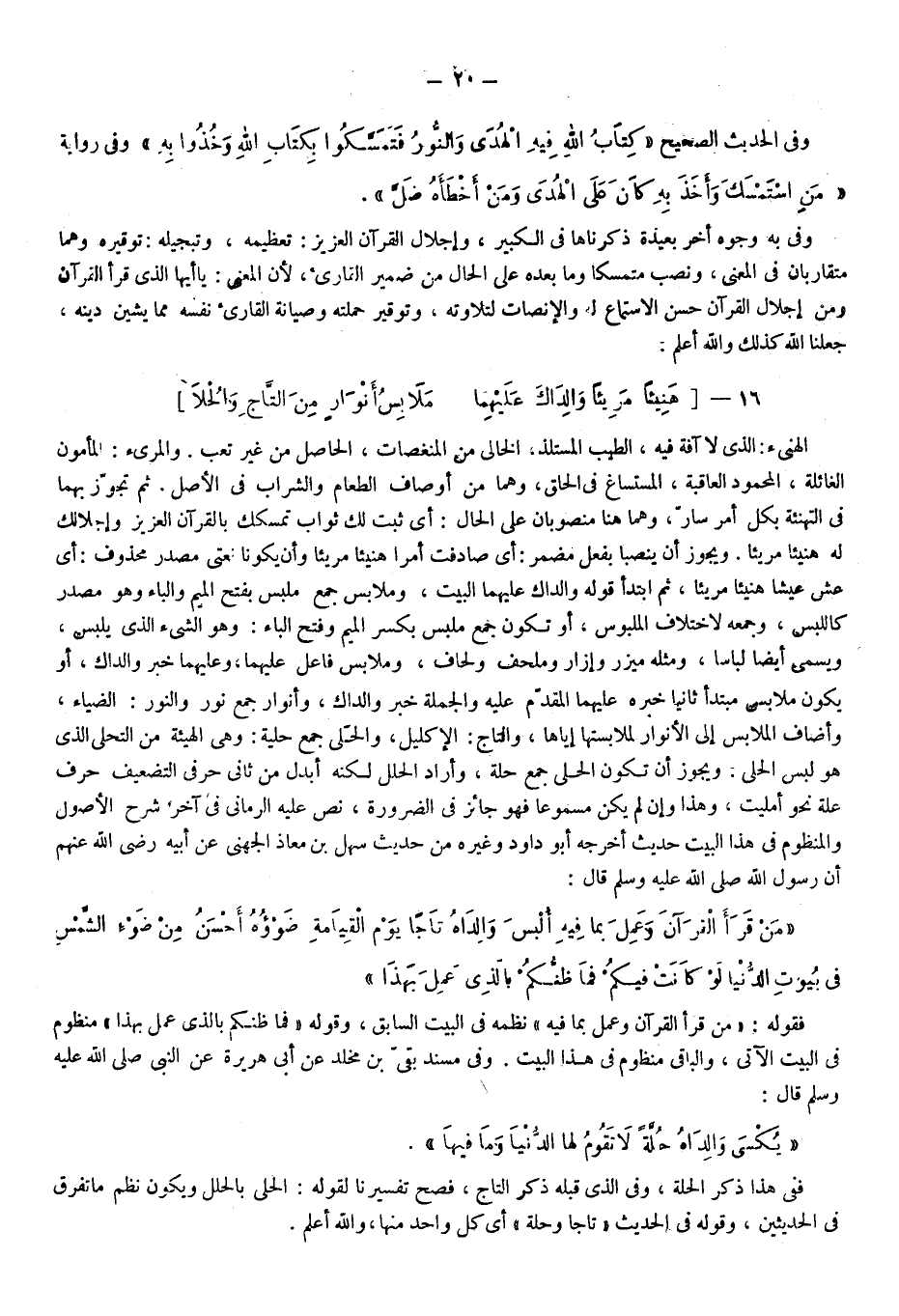 الهنيء: الذي لا آفة فيه، الطيب المستلذ، الخالي من المنغصات، الحاصل من غير تعب، والمريء: المأمون الغائلة المحمود العاقبة، المستساغ في الحلق، وهما من أوصاف الطعام والشراب في الأصل، ثم تجوز بهما في التهنئة بكل أمر سار، وهما هنا منصوبان على الحال أي ثبت لك ثواب تمسكك بالقرآن العزيز وإجلالك له هنيئا مريئا، ويجوز أن ينصبا بفعل مضمر أي صادفت أمرا هنيئا مريئا، وأن يكونا نعتي مصدر محذوف أي كاللبس وجمعه لاختلاف الملبوس، أو تكون جمع ملبس بكسر الميم وفتح الباء وهو الشيء الذي يلبس ويسمى أيضا لباسا ومثله ميزر وإزار وملحف ولحاف وملابس فاعل عليهما وعليهما خبر والداك أو يكون ملابس مبتدأ ثانيًا خبره عليهما المقدم عليه والجملة خبر والداك وأنوار جمع نور والنور الضياء وأضاف الملابس إلى الأنوار؛ لملابستها إياها والتاج الإكليل والحلي جمع حلية وهي الهيئة من التحلي الذي هو لبس الحلي، ويجوز أن تكون الحلي جمع حلة وأراد الحلل لكنه أبدل من ثاني حرفي التضعيف حرف علة نحو أمليت وهذا وإن لم يكن مسموعا فهو جائز في الضرورة نص عليه الرماني في آخر شرح الأصول والمنظوم في هذا البيت حدي أخرجه أبو داود وغيره من حديث سهل بن معاذ الجهني عن أبيه -رضي الله عنه- أن رسول الله -صلى الله عليه وسلم- قال: "من قرأ القرآن وعمل بما فيه ألبس والداه تاجا يوم القيامة ضوؤه أحسن من ضوء الشمس في بيوت الدنيا لو كانت فيكم فما ظنكم بالذي عمل بهذا".