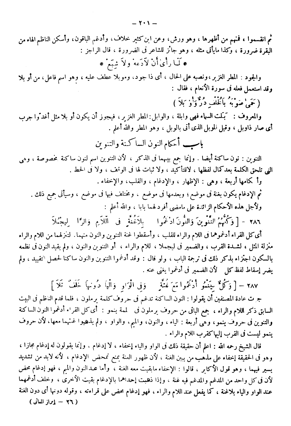 وَكُلُّهُمُ التَّنْوينَ وَالنُّونَ ادْغَمُوا ... بِلاَ غُنَّةٍ فِي الّلاَمِ وَالرَّا لِيَجْمُلا
