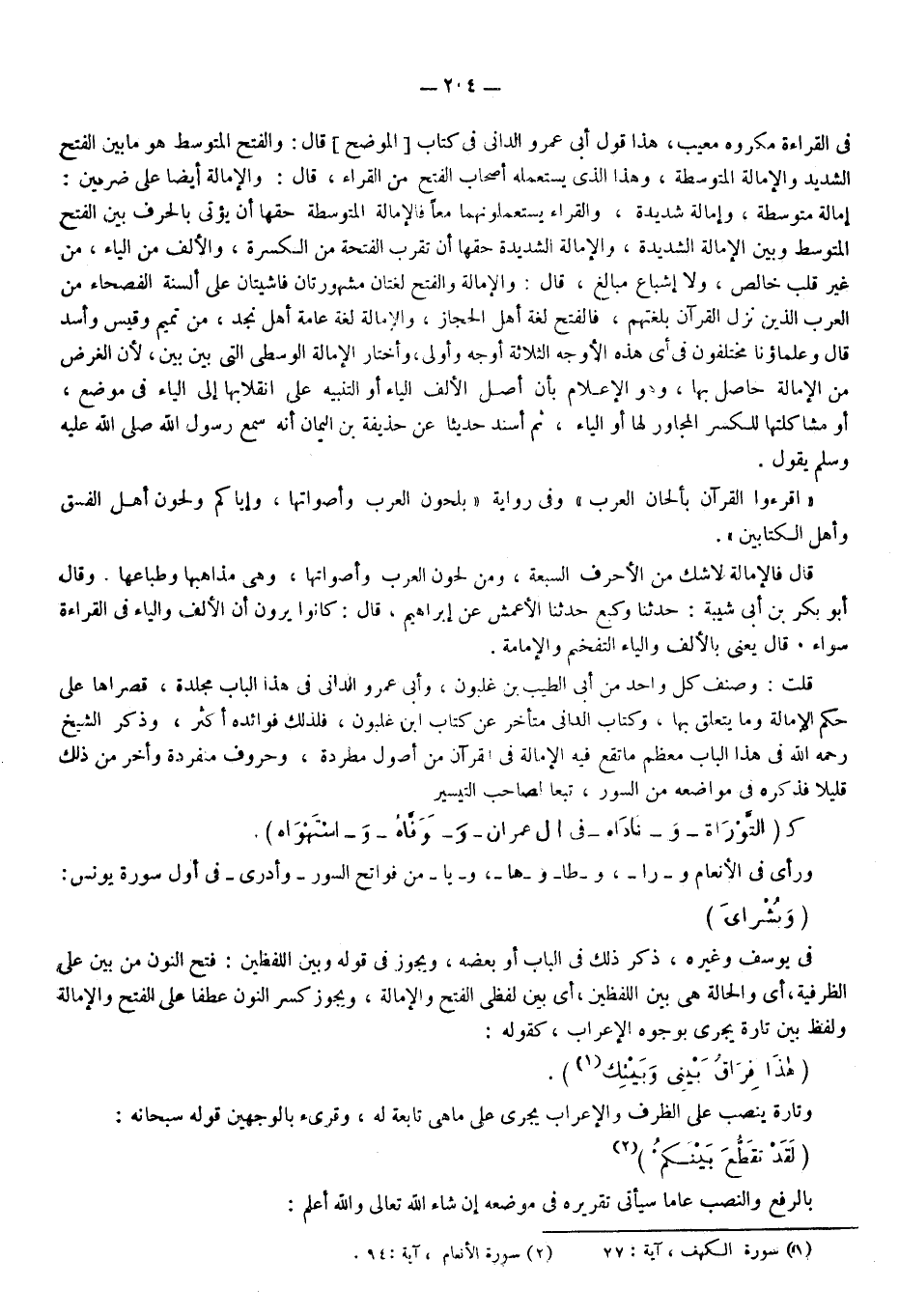 في القراءة مكروه معيب، هذا قول أبي عمرو الداني في كتاب "الموضح" قال: والفتح المتوسط هو ما بين الفتح الشديد والإمالة المتوسطة، وهذا الذي يستعمله أصحاب الفتح من القراء، قال: والإمالة أيضا على ضربين: إمالة متوسطة، وإمالة شديدة، والقراء يستعملونهما معًا؛ فالإمالة المتوسطة حقها أن يؤتى بالحرف بين الفتح المتوسط وبين الإمالة الشديدة، والإمالة الشديدة حقها أن تقرب الفتحة من الكسرة، والألف من الياء، من غير قلب خالص، ولا إشباع مبالغ، قال: والإمالة والفتح لغتان مشهورتان فاشيتان على ألسنة الفصحاء من العرب الذين نزل القرآن بلغتهم، فالفتح لغة أهل الحجاز، والإمالة لغة عامة أهل نجد، من تميم وقيس وأسد قال: وعلماؤنا مختلفون في أي هذه الأوجه الثلاثة أوجه وأولى، وأختار الإمالة الوسطى التي بين بين؛ لأن الغرض من الإمالة حاصل بها، وهو الإعلام بأن أصل الألف الياء أو التنبيه على انقلابها إلى الياء في موضع، أو مشاكلتها للكسر المجاور لها أو الياء، ثم أسند حديثا عن حذيفة بن اليمان أنه سمع رسول الله صلى الله عليه وسلم يقول: "اقرءوا القرآن بألحان العرب" وفي رواية: "بلحون العرب وأصواتها، وإياكم ولحون أهل الفسق وأهل الكتابين".