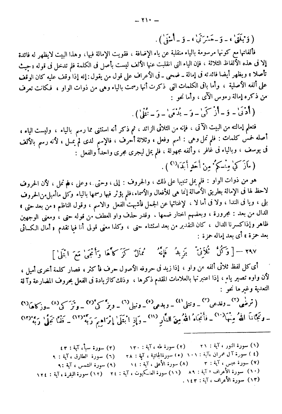 فألفاتها مع كونها مرسومة بالياء منقلبة عن ياء بالإضافة فقويت الإمالة فيها وهذا البيت لا يظهر له فائدة إلا في هذه الألفاظ الثلاثة فإن الياء التي انقلبت عنها الألف ليست بأصل في الكلمة فلم تدخل في قوله: "حيث تأصلا" ويظهر أيضا فائدته في إمالة "ضحى" في الأعراف على قول من يقول إنه إذا وقف عليه كان الوقف على ألفه الأصلية وأما باقي الكلمات التي ذكرت أنها رسمت بالياء وهي من ذوات الواو فكانت تعرف من ذكره إمالة رءوس الآى وأما نحو: "أدنى" و"أزكى" و"يدعى" و"تتلى".