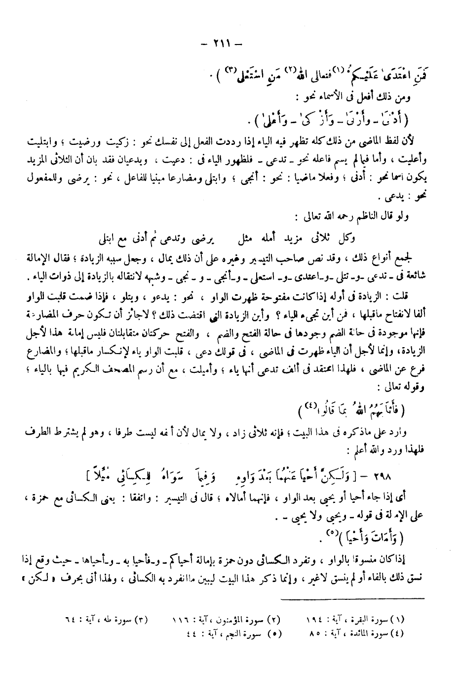 ومن ذلك أفعل في الأسماء نحو: "أدنى، وأرى، وأزكى، وأعلى"؛ لأن لفظ الماضي من ذلك كله تظهر فيه الياء إذا رددت الفعل إلى نفسك نحو: زكيت ورضيت وابتليت وأعليت، وأما فيما لم يسم فاعله نحو "تدعى" فلظهور الياء في دعيت ويدعيان، فقد بان أن الثلاثي المزيد يكون اسما نحو أدنى وفعلا ماضيا نحو أنجى وابتلى ومضارعا مبنيا للفاعل نحو يرضى وللمفعول نحو يدعى.