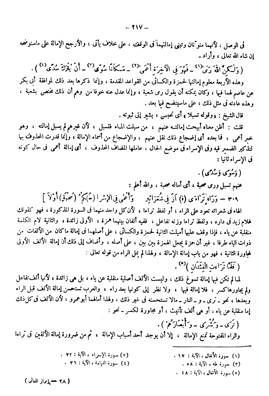 قلت: أظن معناه أبيحت إمالته عنهم من سبلت الماء فتسبل؛ لأن غيرهم لم يسبل إمالته وهو خبر أعمى فما بعده أي إضجاع ذلك نقل عنهم والإضجاع من أسماء الإمالة، وإنما قدرت المحذوف بها لتذكير الضمير فيه، وفي الإسراء في موضع الحال عاملها المضاف المحذوف أي إمالة أعمى في حال كونه في الإسراء ثانيا.