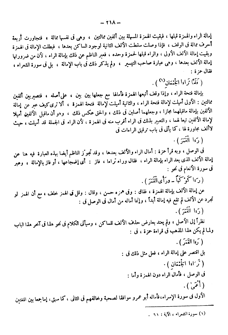 إمالة الراء والهمزة قبلها، فبقيت الهمزة المسهلة بين ألفين ممالتين وهي في نفسها ممالة فتجاورت أربعة أحرف ممالة في الوقف فإذا وصلت سقطت الألف الثانية؛ لوجود الساكن بعدها فبطلت الإمالة في الهمزة وبقيت إمالة الألف الأولى والراء قبلها لحمزة وحده، فعبر الناظم عن ذلك بإمالة الراء؛ لأن من ضرورتها إمالة الألف بعدها وهي عبارة صاحب التيسير ولم يذكر ذلك في باب الإمالة بل في سورة الشعراء فقرا حمزة: "فَلَمَّا تَرَاءَى الْجَمْعَانِ"1 بإمالة فتحة الراء، وإذا وقف أتبعها الهمزة فأمالها مع جعلها بين بين على أصله فتصير بين ألفين ممالتين الأولى أميلت لإمالة فتحة الراء والثانية أميلت لإمالة فتحة الهمزة ألا ترى كيف عبر عن إمالة الألفين بإمالة ما قبلهما مجازا وجعلهما أصلين في ذلك والحق عكس ذلك وهو أن ما قبل الألفين أميلا لإمالة الألفين تبعا لهما والتعبير بذلك في الراء أقرب منه في الهمزة؛ لأن الراء في الجملة قد أميلت حيث لا ألف مجاورة لها كما يأتي في باب ترقيق الراءات في: "رءا القمر" في الوصل وبه قرأ حمزة أمال الراء والألف بعدها وقد تجوز الناظم أيضا بهذه العبارة فيه هنا عن إمالة الألف الذي بعد الراء بإمالة الراء فقال: وراء تراءا، فاز أي إضجاعها أو فاء بالإمالة وعبر في سورة الأنعام في نحو: