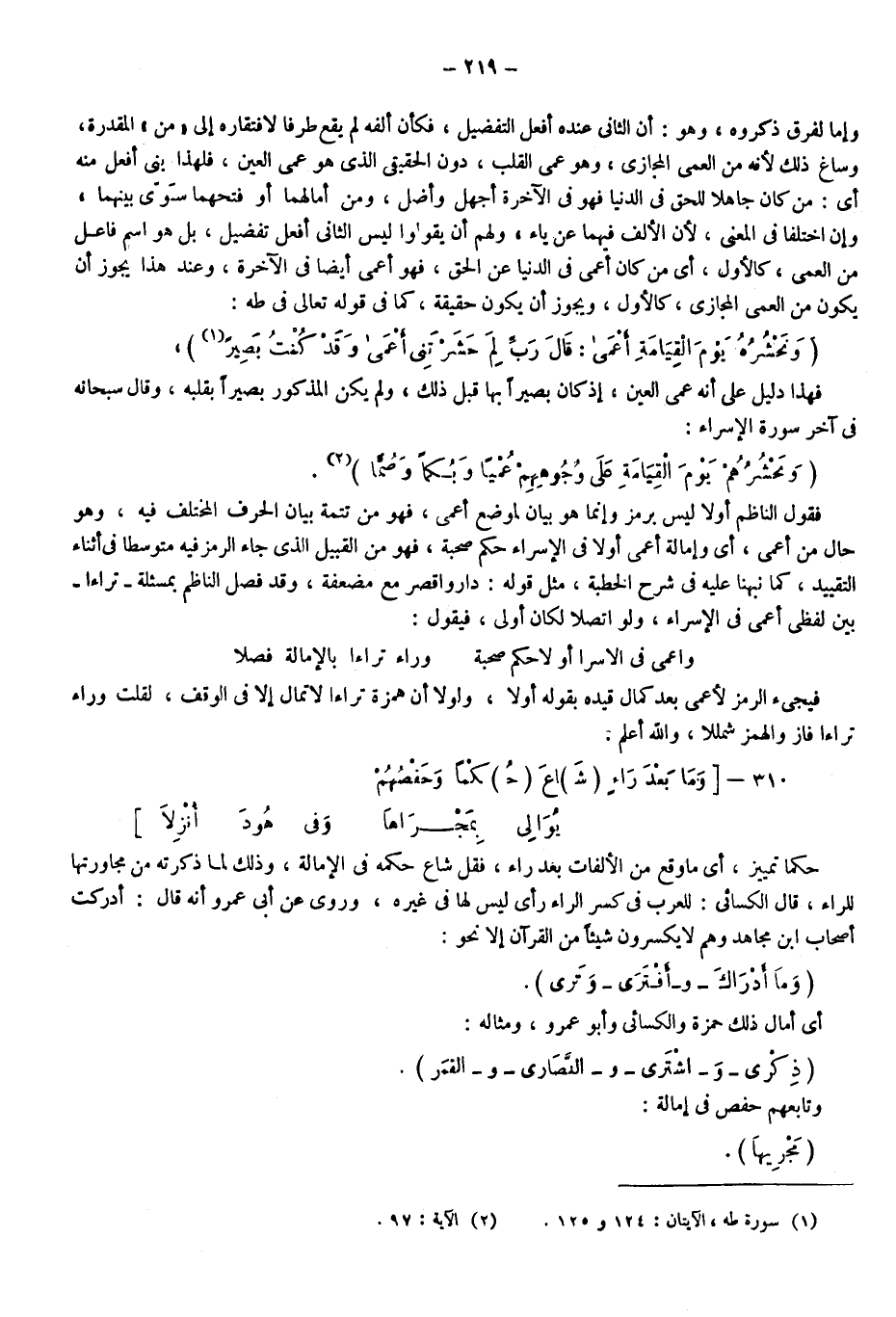 وإما لفرق ذكروه وهو: أن الثاني عنده أفعل التفضيل فكأن ألفه لم يقع طرفا؛ لافتقاره إلى من المقدرة وصاغ ذلك؛ لأنه من العمى المجازي وهو عمي القلب دون الحقيقي الذي هو عمى العين، فلهذا بنى أفعل منه أي من كان جاهلا للحق في الدنيا فهو في الآخرة أجهل وأضل ومن أمالهما أو فتحهما سوى بينهما وإن اختلفا في المعنى؛ لأن الألف فيهما عن ياء ولهم أن يقولوا ليس الثاني أفعل تفضيل بل هو اسم فاعل من العمى كالأول؛ أي من كان أعمى في الدنيا عن الحق فهو أعمى أيضا في الآخرة، وعند هذا يجوز أن يكون من العمى المجازي كالأول، ويجوز أن يكون حقيقة كما في قوله تعالى في طه: {وَنَحْشُرُهُ يَوْمَ الْقِيَامَةِ أَعْمَى، قَالَ رَبِّ لِمَ حَشَرْتَنِي أَعْمَى وَقَدْ كُنْتُ بَصِيرًا} 1، فهذا دليل على أنه عمى العين؛ إذ كان بصيرا بها قبل ذلك ولم يكن المذكور بصيرا بقلبه وقال سبحانه في آخر سورة الإسراء: {وَنَحْشُرُهُمْ يَوْمَ الْقِيَامَةِ عَلَى وُجُوهِهِمْ عُمْيًا وَبُكْمًا وَصُمًّا} 2.
