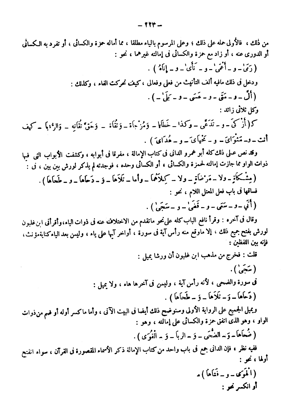 قلت: فخرج من مذهب ابن غلبون أن ورشا يميل: "سجى" في سورة والضحى؛ لأنه رأس آية وليس في آخرها هاء ولا يميل: "دحاها" و"تلاها" و"طحاها" ويميل الجميع على الرواية الأولى وسنوضح ذلك أيضا في البيت الآتي، وأما ما كسر أوله أو ضم من ذوات الواو وهو الذي اتفق حمزة والكسائي على إمالته وهو: "ضحاها" و"الضحى" و"الربا" و"القوى" ففيه نظر؛ فإن الداني جمع في باب واحد من كتاب الإمالة ذكر الأسماء المقصورة في القرآن سواء انفتح أولها نحو: "الهوى" و"فتاها". أو انكسر نحو: