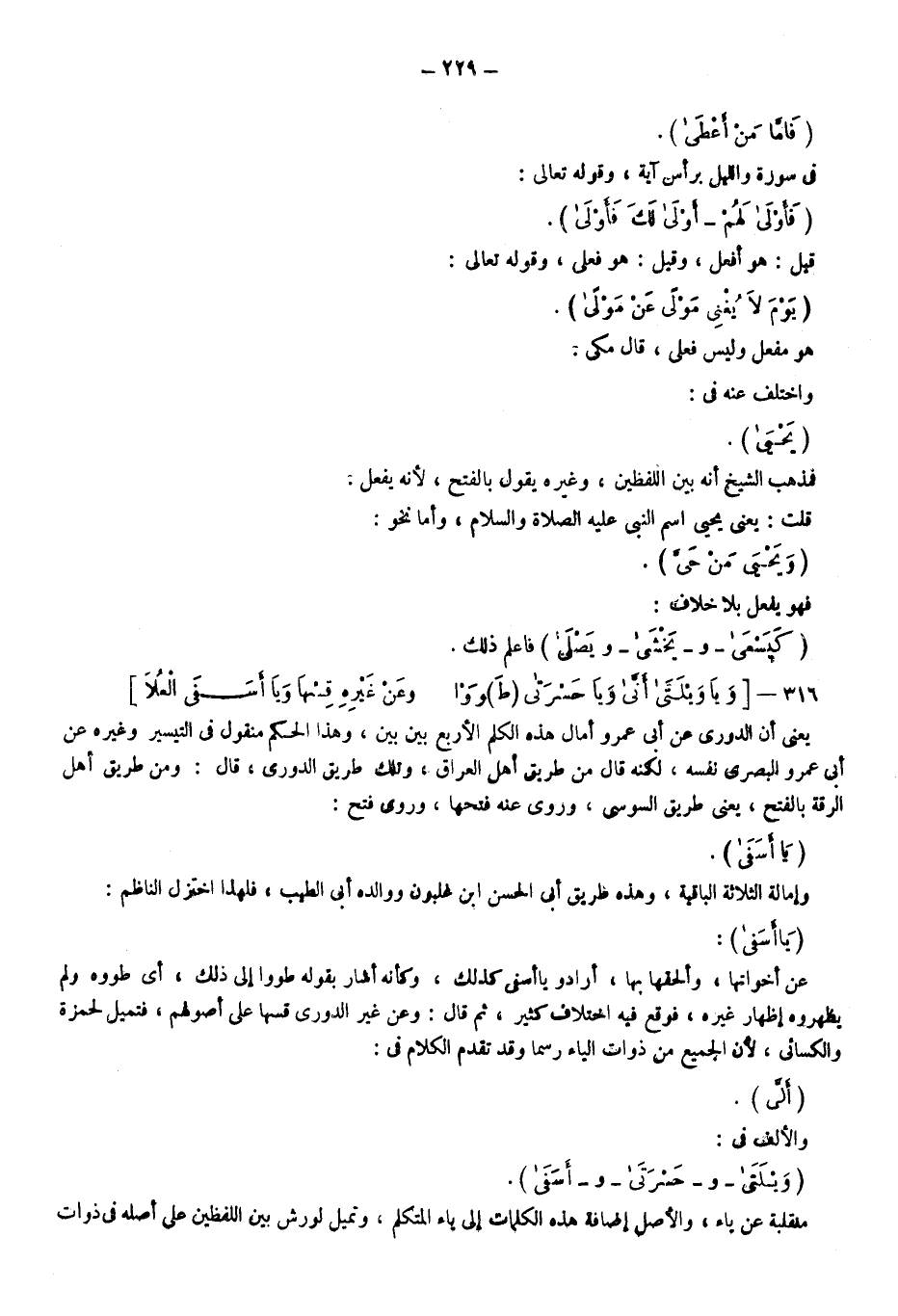 {فَأَمَّا مَنْ أَعْطَى} في سورة والليل برأس آية، وقوله تعالى: {فَأَوْلَى لَهُمْ} ، {أَوْلَى لَكَ فَأَوْلَى} ، قيل هو أفعل وقيل هو فعلى، وقوله تعالى: {يَوْمَ لا يُغْنِي مَوْلىً عَنْ مَوْلىً} ، هو مفعل وليس فعلى. قال مكي: واختلف عنه في: "يحيى"؛ فمذهب الشيخ أنه بين اللفظين وغيره يقول بالفتح؛ لأنه يفعل.