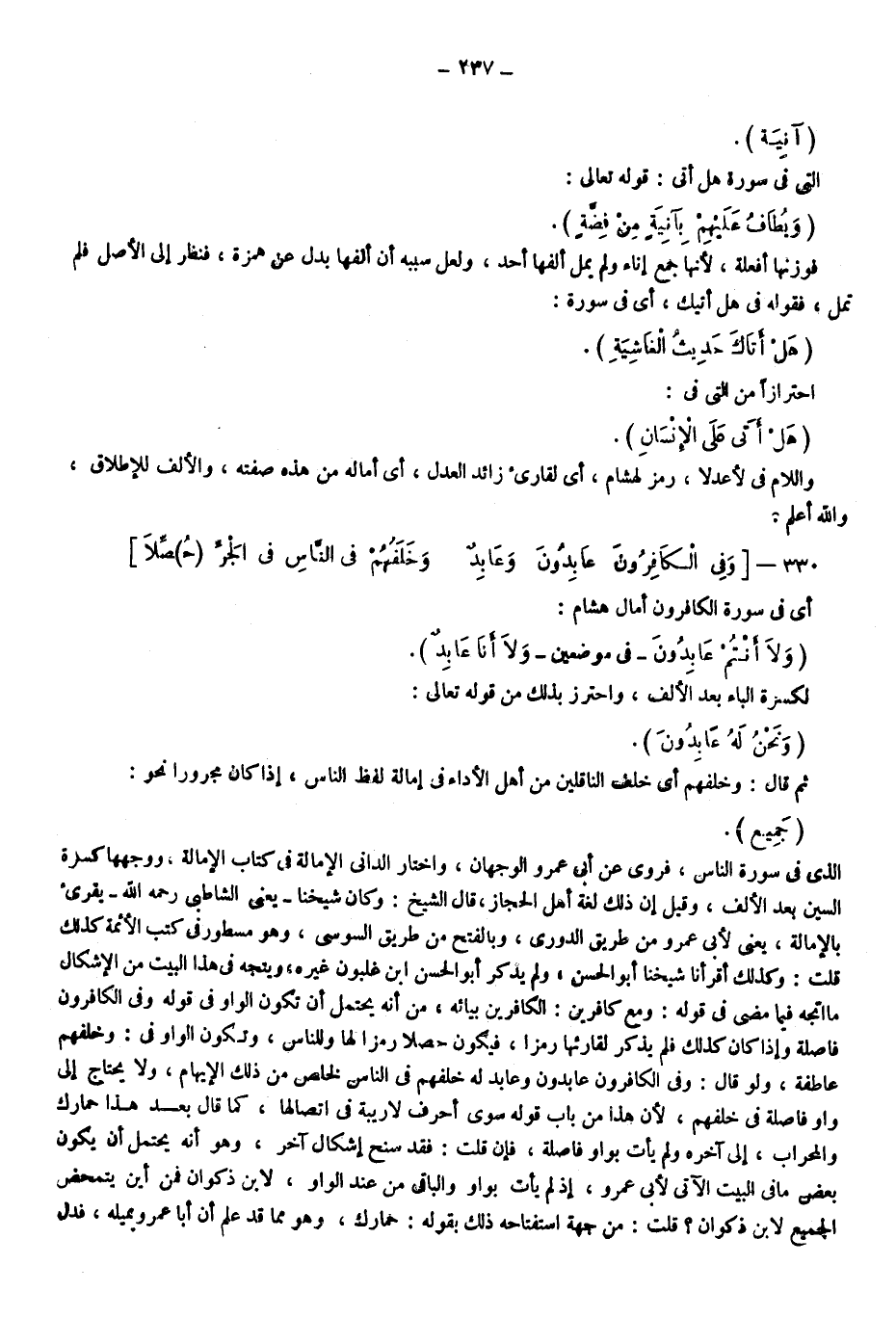 {آنِيَةٍ} التي في سورة هل أتى قوله تعالى: {وَيُطَافُ عَلَيْهِمْ بِآنِيَةٍ مِنْ فِضَّةٍ} فوزنها أفعلة؛ لأنها جمع إناء ولم يمل ألفها أحد ولعل سببه أن ألفها بدل عن همزة فنظر إلى الأصل فلم تمل فقوله في هل أتيك أي في سورة: {هَلْ أَتَاكَ حَدِيثُ الْغَاشِيَةِ} احترازا من التي في: {هَلْ أَتَى عَلَى الْإِنْسَانِ} ، واللام في لأعدلا رمز لهشام أي لقارئ زائد العدل أي أماله من هذه صفته والألف للإطلاق والله أعلم.
