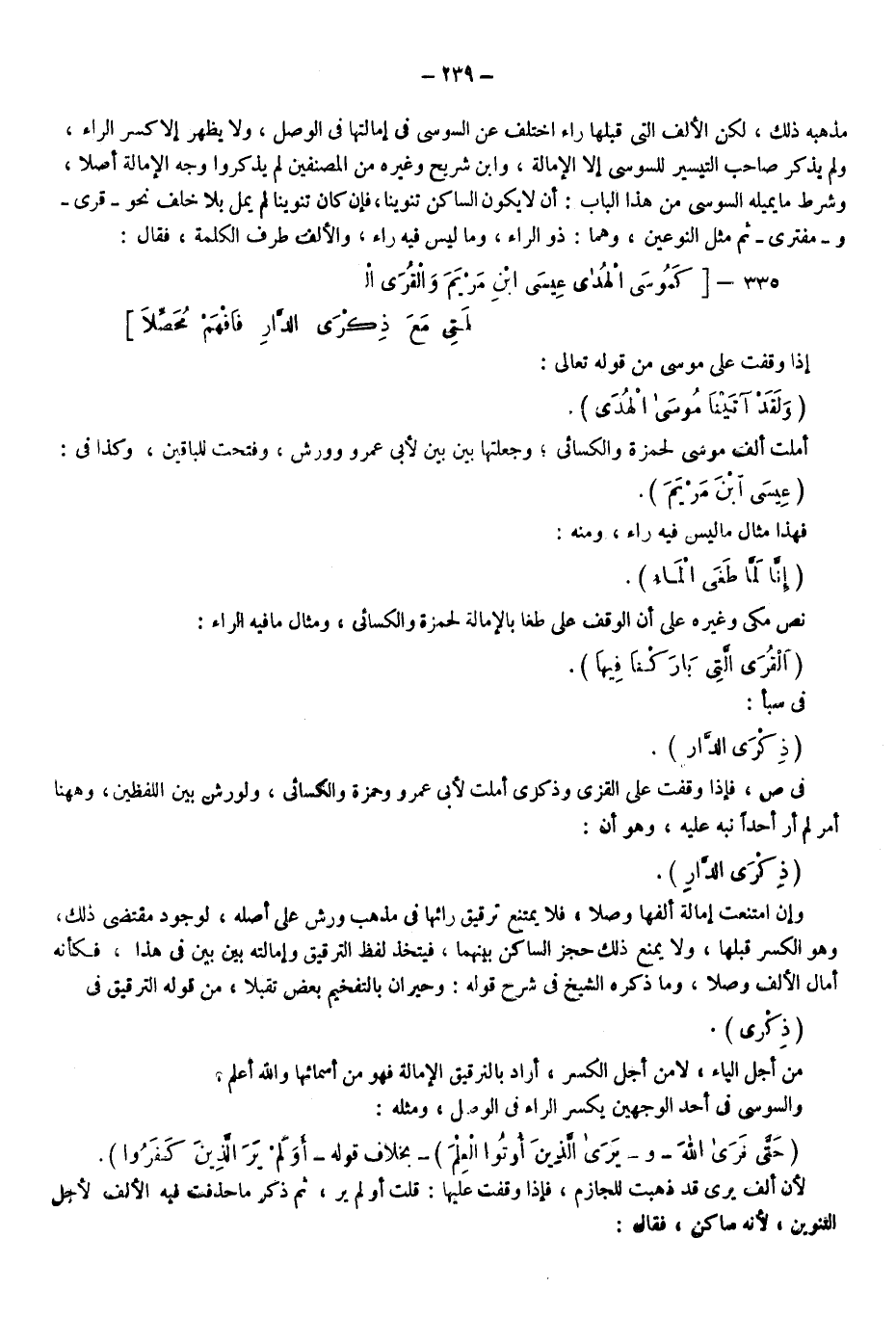 إذا وقفت على موسى من قوله تعالى: {وَلَقَدْ آتَيْنَا مُوسَى الْهُدَى} أملت ألف موسى لحمزة والكسائي وجعلتها بين بين لأبي عمرو وورش وفتحت للباقين وكذا في: {عِيسَى ابْنِ مَرْيَمَ} فهذا مثال ما ليس فيه راء ومنه: "إنا لما طغى الماء" نص مكي وغيره على أن الوقف على طغى بالإمالة لحمزة والكسائي ومثال ما فيه الراء: