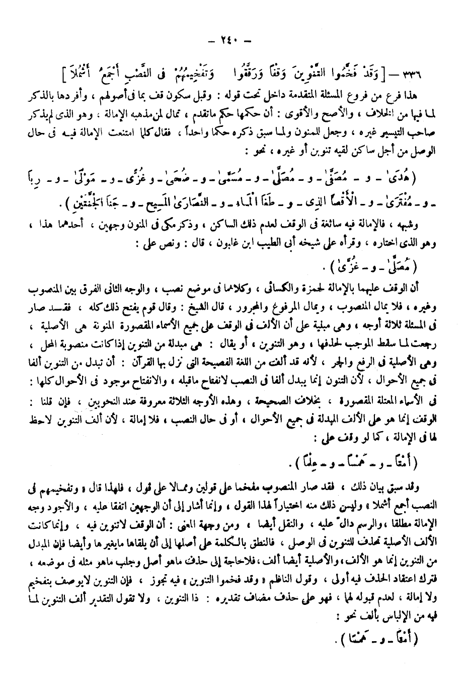 هذا فرع من فروع المسألة المتقدمة داخل تحت قوله وقبل سكون قف بما في أصولهم وأفردها بالذكر لما فيها من الخلاف والأصح والأقوى أن حكمها حكم ما تقدم تمال لمن مذهبه الإمالة، وهو الذي لم يذكر صاحب التيسير غيره، وجعل للمنون ولما سبق ذكره حكما واحدا، فقال: كلما امتنعت الإمالة فيه في حال الوصل من أجل ساكن لقيه تنوين أو غيره نحو: "هدى" و"مصفى" و"مصلى" و"مسمى" و"ضحى" و"غزى" و"مولى" و"ربا" و"مفترى" و"الأقصا الذي" و"طغا الماء" و"النصارى المسيح" و"جنا الجنتين".... وشبهه، فالإمالة فيه سائغة في الوقف؛ لعدم ذلك الساكن، وذكر مكي في المنون وجهين أحدهما هذا وهو الذي اختاره، وقرأه على شيخه أبي الطيب ابن غلبون قال: ونص على: "مصلى" و"غزى" أن الوقف عليهما بالإمالة لحمزة والكسائي وكلاهما في موضع نصب، والوجه الثاني الفرق بين المنصوب وغيره فلا يمال المنصوب ويمال المرفوع والمجرور قال الشيخ: وقال قوم: يفتح ذلك كله فقد صار في المسألة ثلاثة أوجه وهي مبنية على أن الألف في الوقف على جميع الأسماء المقصورة المنونة هي الأصلية رجعت لما سقط الموجب لحذفها وهو التنوين أو يقال: هي مبدلة من التنوين إذا كانت منصوبة المحل، وهي الأصلية في الرفع والجر؛ لأنه قد ألف من اللغة الفصيحة التي نزل بها القرآن أن تبدل من التنوين ألفا في جميع الأحوال؛ لأن التنوين إنما يبدل ألفا في النصب؛ لانفتاح ما قبله، والانفتاح موجود في الأحوال كلها في الأسماء المعتلة المقصورة بخلاف الصحيحة، وهذه الأوجه الثلاثة معروفة عند النحويين فإن قلنا الوقف إنما هو على الألف المبدلة في جميع الأحوال أو في حال النصب فلا إمالة؛ لأن ألف التنوين لا حظ لها في الإمالة كما لو وقف على: "أمتا" و"همسا" و"علما".