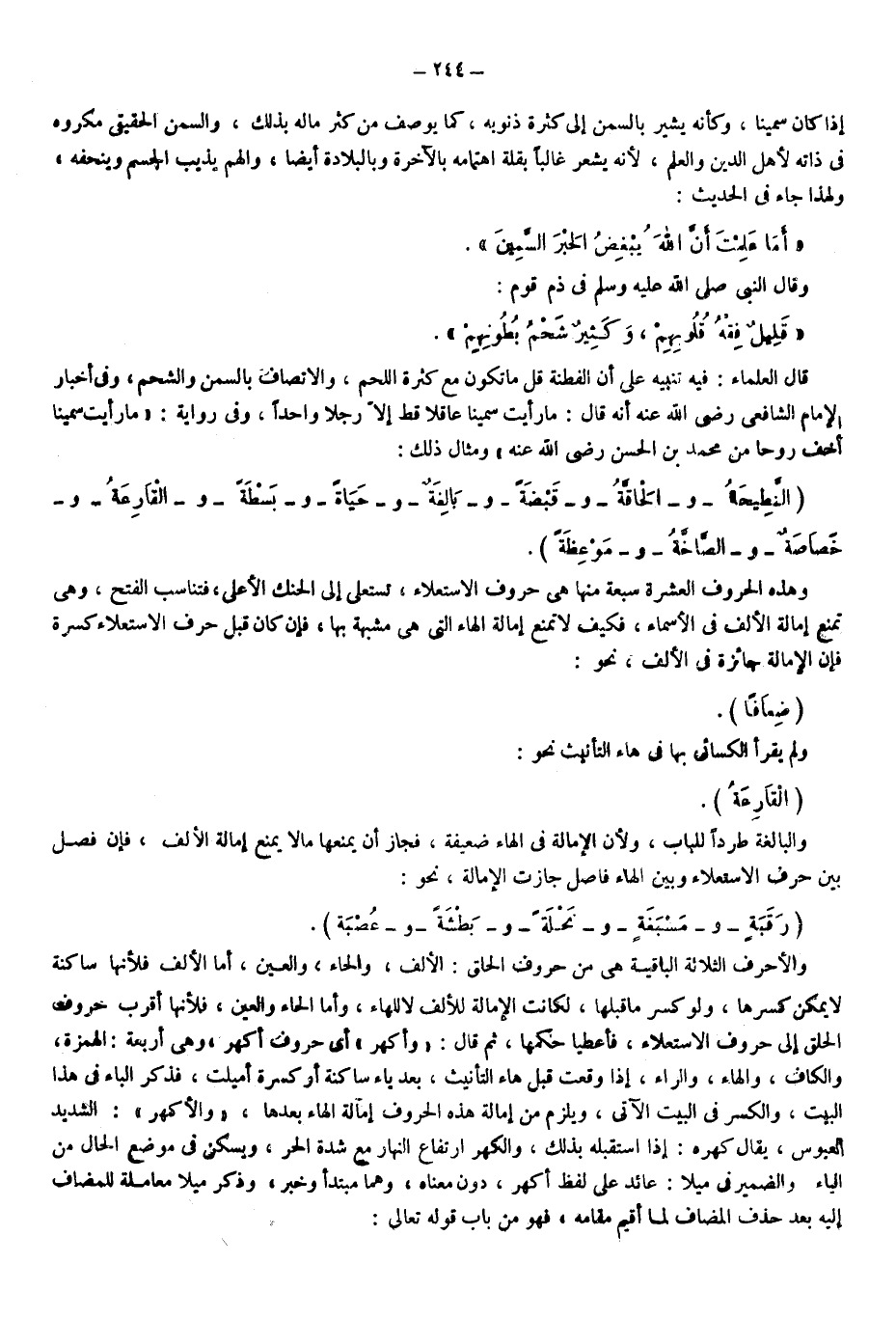 قال العلماء: فيه تنبيه على أن الفطنة قل ما تكون مع كثرة اللحم والاتصاف بالسمن والشحم وفي أخبار الإمام الشافعي -رضي الله عنه- أنه قال ما رأيت سمينا عاقلا قط إلا رجلا واحدا وفي رواية: ما رأيت سمينا أخف روحا من محمد بن الحسن -رضي الله عنه- ومثال ذلك: "النطيحة" و"الحاقة" و"قبضة" و"بالغة" و"حياة" و"بسطة" و"القارعة" و"خصاصة" و"الصاخة" و"موعظة"، وهذه الحروف العشرة سبعة منها هي حروف الاستعلاء تستعلى إلى الحنك الأعلى فتناسب الفتح، وهي تمنع إمالة الألف في الأسماء فكيف لا تمنع إمالة الهاء التي هي مشبهة بها فإن كان قبل حرف الاستعلاء كسرة فإن الإمالة جائزة في الألف نحو: {ضِعَافًا} ، ولم يقرأ الكسائي بها في هاء التأنيث نحو: {الْقَارِعَةِ} ، والبالغة طردا للباب، ولأن الإمالة في الهاء ضعيفة، فجاز أن يمنعها ما لا يمنع إمالة الألف فإن فصل بين حرف الاستعلاء وبين الهاء فاصل جازت الإمالة نحو: "رقبة" و"مسبغة" و"نحلة" و"بطشة" و"عصبة"، والأحرف الثلاثة الباقية هي من حروف الحلق الألف والحاء والعين أما الألف فلأنها ساكنة لا يمكن كسرها ولو كسر ما قبلها لكانت الإمالة للألف لا للهاء، وأما الحاء والعين، فلأنها أقرب حروف الحلق إلى حروف الاستعلاء، فأعطيا حكمها، ثم قال: "وأكهر" أي حروف أكهر، وهي أربعة: الهمزة والكاف والهاء والراء إذا وقعت قبل هاء التأنيث بعد ياء ساكنة أو كسرة أميلت، فذكر الباء في هذا البيت، والكسر في البيت الآتي، ويلزم من إمالة هذه الحروف إمالة الهاء بعدها، "والأكهر": الشديد العبوس، يقال كهره إذا استقبله بذلك، والكهر ارتفاع النهار مع شدة الحر، ويسكن في موضع الحال من الياء، والضمير في ميلا عائد على لفظ أكهر دون معناه، وهما مبتدأ وخبر وذكر ميلا معاملة للمضاف إليه بعد حذف المضاف لما أقيم مقامه فهو من باب قوله تعالى: