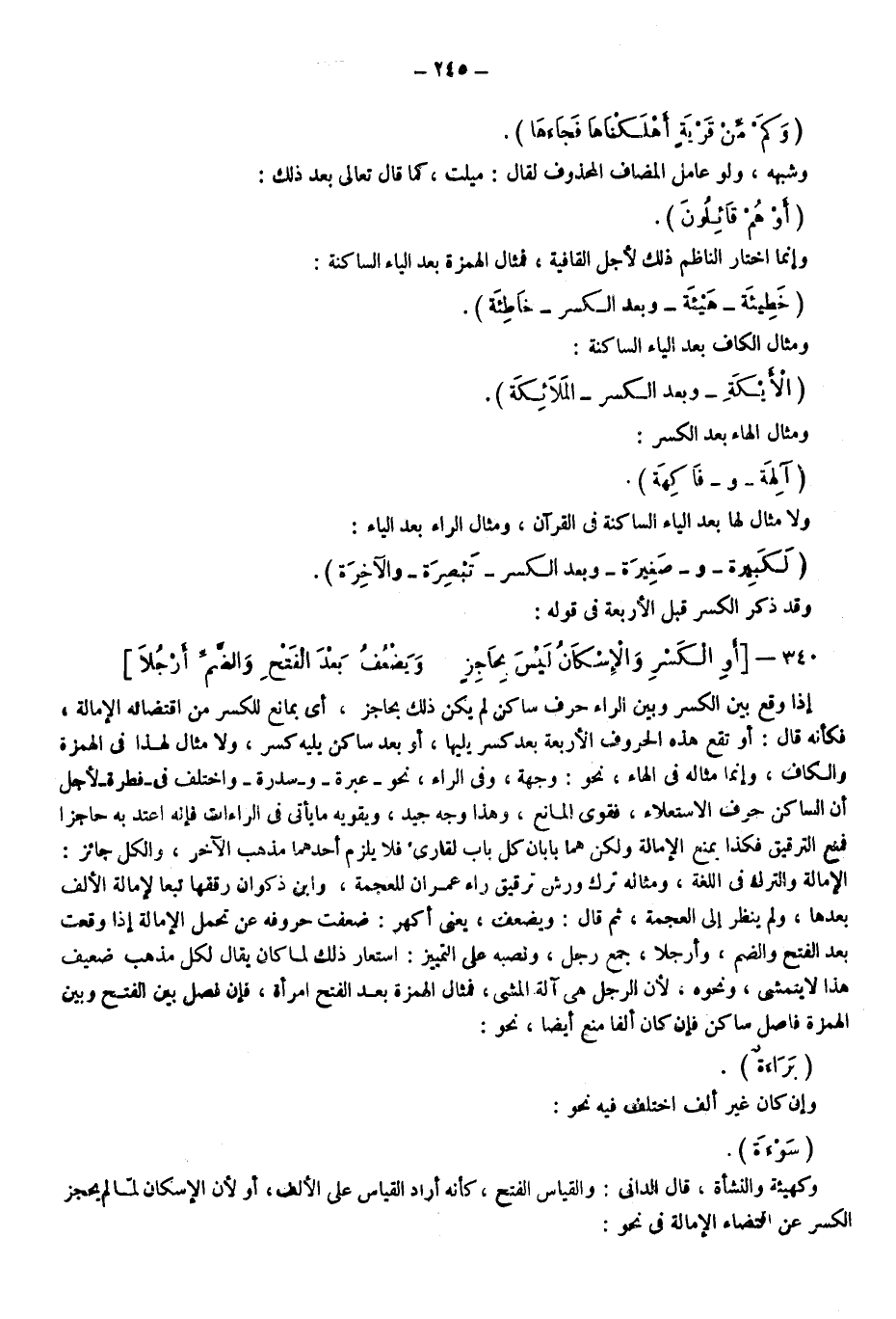 {وَكَمْ مِنْ قَرْيَةٍ أَهْلَكْنَاهَا فَجَاءَهَا} ، وشبهه ولو عامل المضاف المحذوف لقال ميلت كما قال تعالى بعد ذلك: {أَوْ هُمْ قَائِلُونَ} ، وإنما اختار الناظم ذلك لأجل القافية فمثال الهمزة بعد الياء الساكنة: "خطيئة" "هيئة" وبعد الكسر "خاطئة".