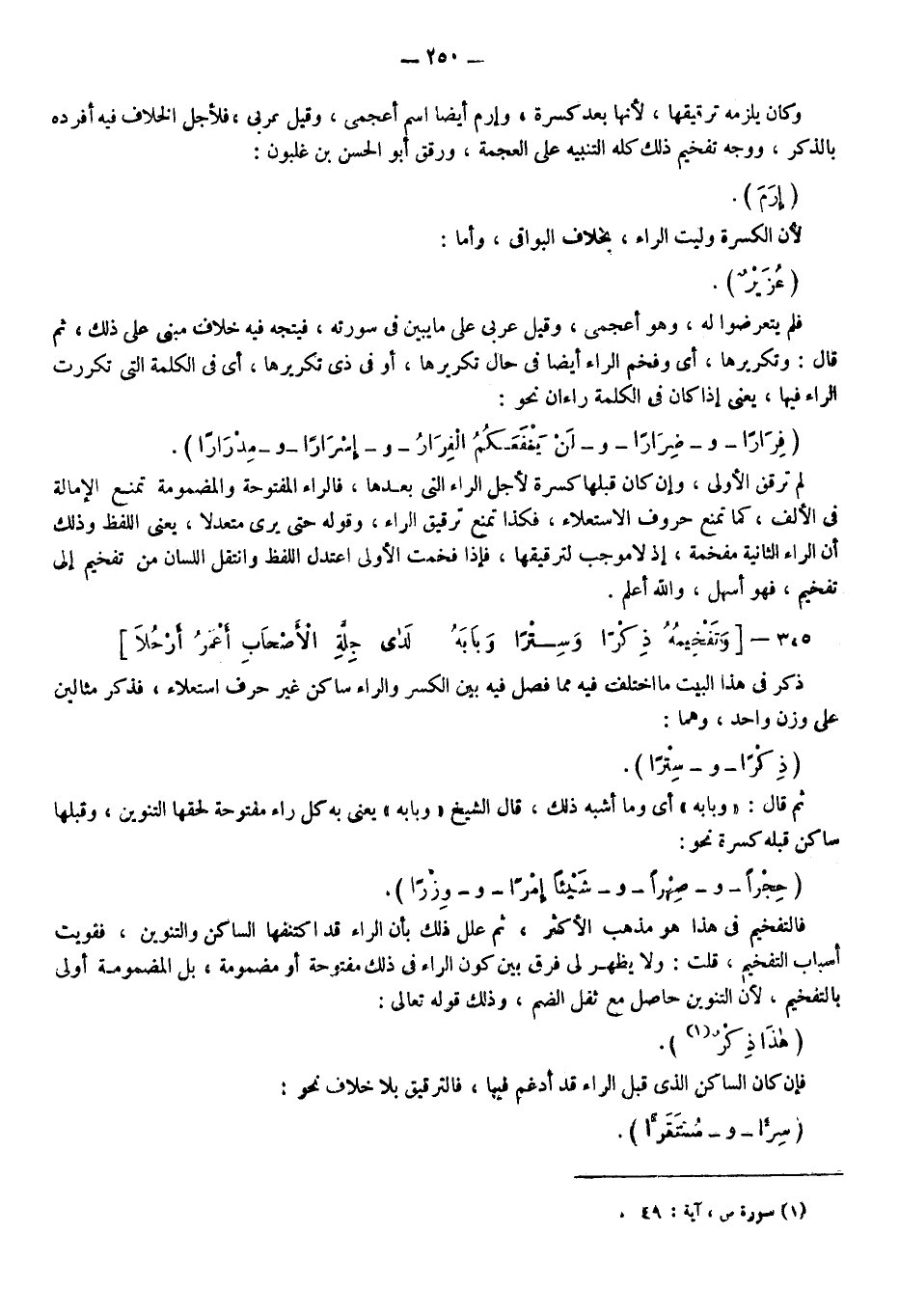 وكان يلزمه ترقيقها؛ لأنها بعد كسرة وإرم أيضا اسم أعجمي وقيل عربي فلأجل الخلاف فيه أفرده بالذكر، ووجه تفخيم ذلك كله التنبيه على العجمة، ورقق أبو الحسن بن غلبون: {إِرَمَ} ؛ لأن الكسرة وليت الراء بخلاف البواقي وأما: {عَزِيزٌ} ، فلم يتعرضوا له وهو أعجمي وقيل عربي على ما يبين في سورته فيتجه فيه خلاف مبني على ذلك ثم قال: وتكريرها أي، وفخم الراء أيضا في حال تكريرها، أو في ذي تكريرها أي في الكلمة التي تكررت الراء فيها يعني إذا كان في الكلمة راءان نحو: "فرارا" و"ضرارا" و"لن ينفعكم الفرار" و"إسرارا" و"مدرارا"، لم ترقق الأولى وإن كان قبلها كسرة؛ لأجل الراء التي بعدها فالراء المفتوحة والمضمومة تمنع الإمالة في الألف كما تمنع حروف الاستعلاء فكذا تمنع ترقيق الراء وقوله: حتى يرى متعدلا يعني اللفظ، وذلك أن الراء الثانية مفخمة؛ إذ لا موجب لترقيقها، فإذا فخمت الأولى اعتدل اللفظ، وانتقل اللسان من تفخيم إلى تفخيم فهو أسهل والله أعلم.