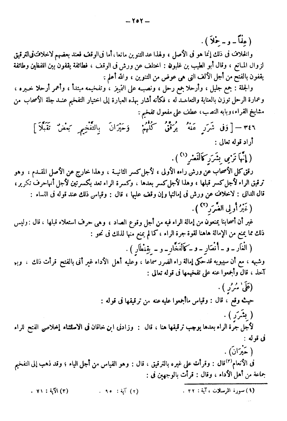 أراد قوله تعالى: {إِنَّهَا تَرْمِي بِشَرَرٍ كَالْقَصْرِ} 1، رقق كل الأصحاب عن ورش راءه الأولى؛ لأجل كسر الثانية، وهذا خارج عن الأصل المقدم وهو ترقيق الراء لأجل كسر قبلها، وهذا لأجل كسر بعدها وكسرة الراء تعد بكسرتين لأجل أنها حرف تكرير. قال الداني: لا خلاف عن ورش في إمالتها وإن وقف عليها قال: وقياس ذلك عند قوله في النساء: {غَيْرُ أُولِي الضَّرَرِ} 2. غير أن أصحابنا يمنعون من إمالة الراء فيه من أجل وقوع الصاد وهي حرف استعلاء قبلها، قال: وليس ذلك مما يمنع من الإمالة ههنا؛ لقوة جرة الراء كما لم يمنع منها لذلك في نحو: "الْغَارِ"، و"أَنْصَارَ"، و"كَالْفَخَّارِ"، و"بِقِنْطَارٍ"، وشبهه مع أن سيبويه قد حكى إمالة راء الضرر سماعا وعليه أهل الأداء، غير أني بالفتح قرأت ذلك، وبها آخذ. قال: وأجمعوا عنه على تفخيمها في قوله تعالى: {عَلَى سُرُرٍ} حيث وقع، قال: وقياس ما أجمعوا عليه عنه من ترقيقها في قوله: "بِشَرَرٍ"؛ لأجل جرة الراء بعدها يوجب ترقيقها هنا، قال: وزادني ابن خاقان في الاستثناء إخلاص الفتح للراء في قوله: {حَيْرَانَ} في الأنعام3، قال: وقرأت على غيره بالترقيق قال: وهو القياس من أجل الياء، وقد ذهب إلى التفخيم جماعة من أهل الأداء، وقال: قرأت بالوجهين في: