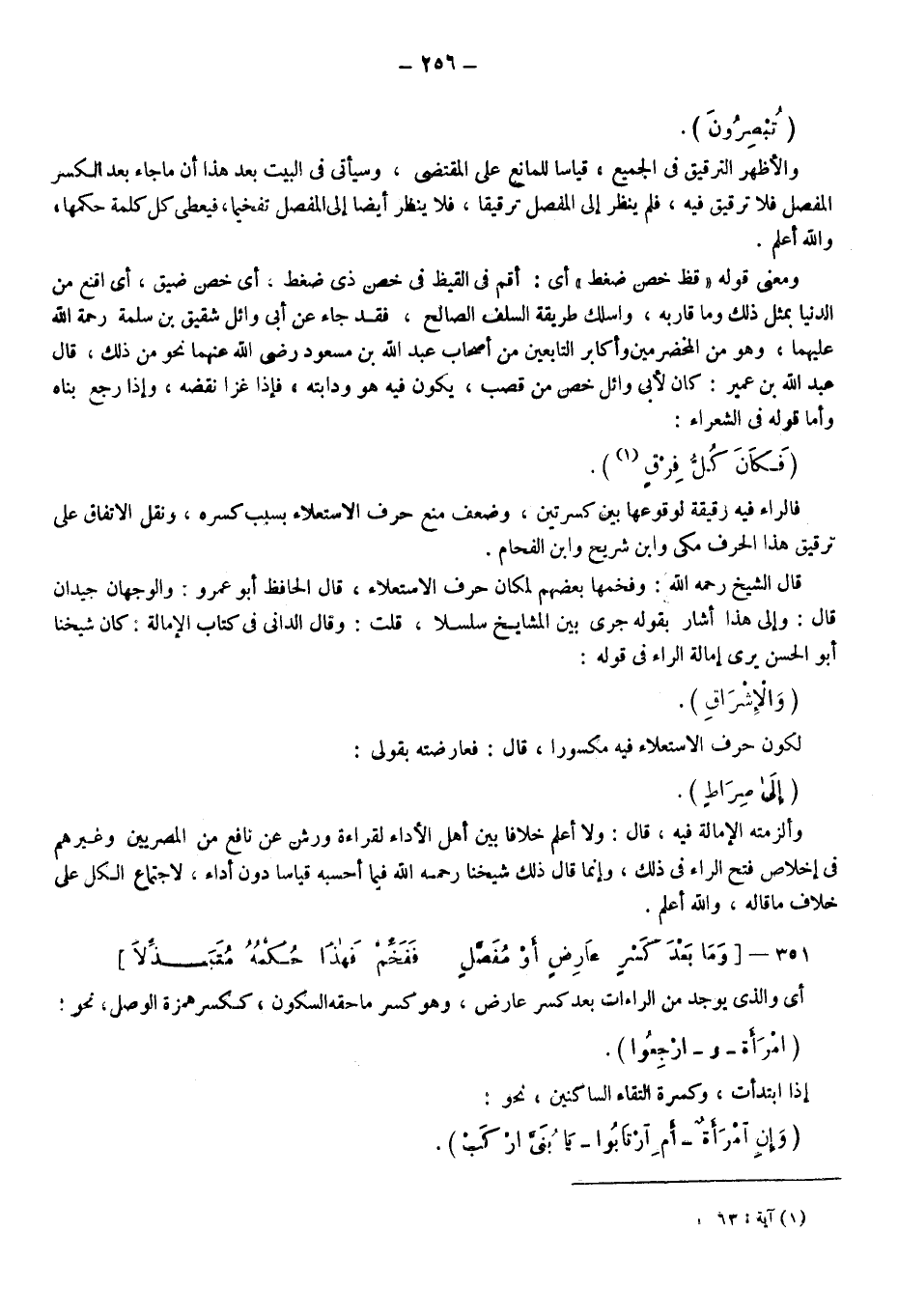 قال الشيخ رحمه الله: وفخمها بعضهم لمكان حرف الاستعلاء، قال الحافظ أبو عمرو: والوجهان جيدان. قال: وإلى هذا أشار بقوله: جرى بين المشايخ سلسلا. قلت: وقال الداني في كتاب الإمالة: كان شيخنا أبو الحسن يرى إمالة الراء في قوله: {وَالْإِشْرَاقِ} ؛ لكون حرف الاستعلاء فيه مكسورا قال فعارضته بقوله: {إِلَى صِرَاطٍ} ، وألزمته الإمالة فيه، قال: ولا أعلم خلافا بين أهل الأداء لقراءة ورش عن نافع من المصريين وغيرهم في إخلاص فتح الراء في ذلك، وإنما قال ذلك شيخنا -رحمه الله- فيما أحسبه قياسا دون أداء؛ لاجتماع الكل على خلاف ما قاله والله أعلم.