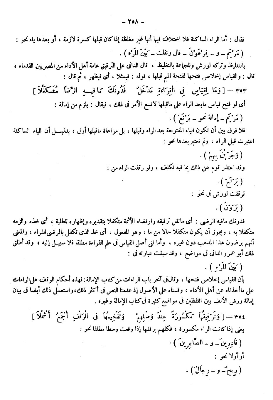 فقال: أما الراء الساكنة فلا اختلاف فيها أنها غير مغلظة إذا كان قبلها كسرة لازمة أو بعدها ياء نحو: "مَرْيَمَ"، و"فِرْعَوْنَ"، قال: ونقلت: {بَيْنَ الْمَرْءِ} بالتغليظ وتركه لورش وللجماعة بالتغليظ، قال الداني: على الترقيق عامة أهل الأداء من المصريين القدماء، قال: والقياس إخلاص فتحها لفتحة الميم قبلها، قوله: فيمثلا أي فيظهر ثم قال: