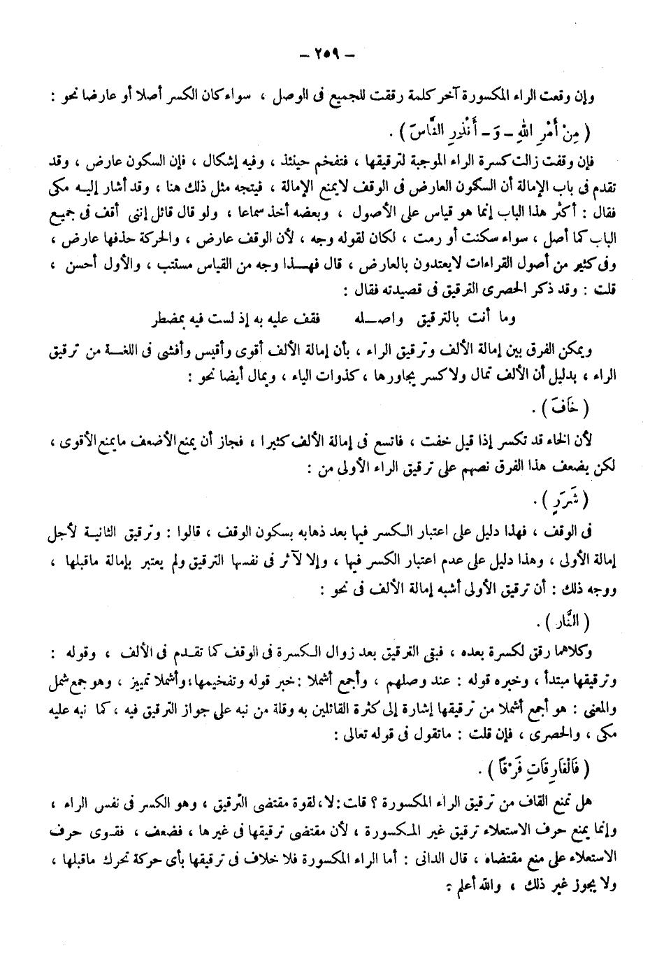 ويمكن الفرق بين إمالة الألف وترقيق الراء بأن إمالة الألف أقوى وأقيس وأفشى في اللغة من ترقيق الراء؛ بدليل أن الألف تمال ولا كسر يجاورها كذوات الياء ويمال أيضا نحو: "خَاف"؛ لأن الخاء قد تكسر إذا قيل: خفت فاتسع في إمالة الألف كثيرًا فجاز أن يمنع الأضعف ما يمنع الأقوى لكن يضعف هذا الفرق نصهم على ترقيق الراء الأولى من: "شَرَرٍ" في الوقف، فهذا دليل على اعتبار الكسر فيها بعد ذهابه بسكون الوقف قالوا وترقيق الثانية لأجل إمالة الأولى، وهذا دليل على عدم اعتبار الكسر فيها وإلا لآثر في نفسها الترقيق، ولم يعتبر بإمالة ما قبلها، ووجه ذلك أن ترقيق الأولى أشبه إمالة الألف في نحو: "النَّارِ".