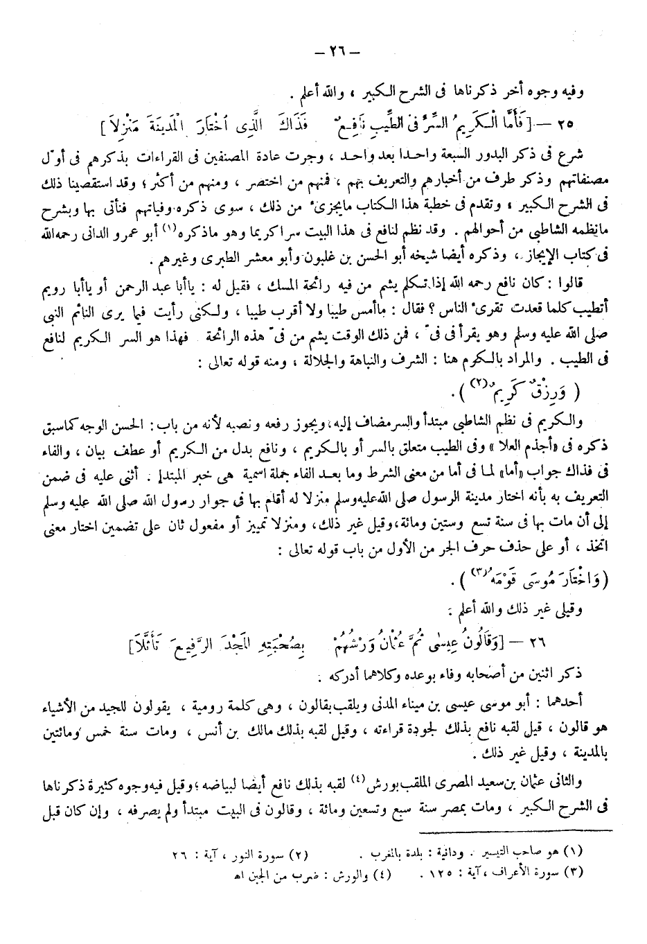 شرع في ذكر البدور السبعة واحدا بعد واحد وجرت عادة المصنفين في القراءات بذكرهم في أول مصنفاتهم وذكر طرف من أخبارهم والتعريف بهم فمنهم من اختصر ومنهم من أكثر وقد استقصينا ذلك في الشرح الكبير وتقدم في خطبة هذا الكتاب ما يجزئ من ذلك سوى ذكره وفياتهم فنأتي بها وبشرح ما نظمه الشاطبي من أحوالهم، وقد نظم لنافع في هذا البيت سرًّا كريما وهو ما ذكره1 أبو عمرو الداني -رحمه الله- في كتاب الإيجاز وذكره أيضا شيخه أبو الحسن بن غلبون وأبو معشر الطبري وغيرهم.