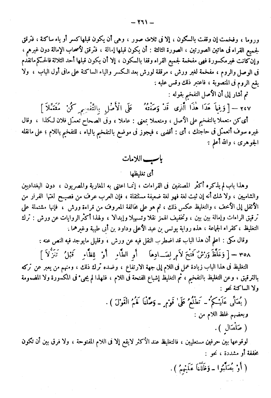 وهذا باب لم يذكره أكثر المصنفين في القراءات، إنما اعتنى به المغاربة والمصريون، دون البغداديين والشاميين، ولا شك أنه إن ثبت لغة فهو لغة ضعيفة مستثقلة؛ فإن العرب عرف من فصيح لغتها الفرار من الأثقل إلى الأخف، والتغليظ عكس ذلك، ثم هو على مخالفة المعروف من قراءة ورش، فإنها مشتملة على ترقيق الراءات وإمالة بين بين، وتخفيف الهمز نقلا وتسهيلاً وإبدالا، ولهذا أكثر الروايات عن ورش: ترك التغليظ، كقراء الجماعة، هذه رواية يونس بن عبد الأعلى وداود بن أبي طيبة وغيرهما.