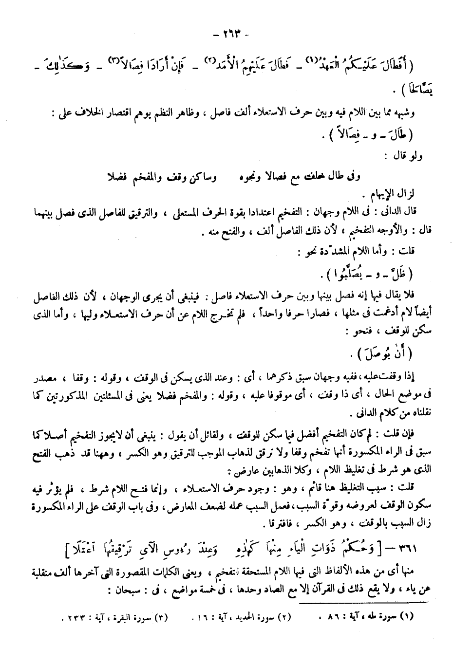 {أَفَطَالَ عَلَيْكُمُ الْعَهْدُ} 1، {فَطَالَ عَلَيْهِمُ الْأَمَدُ} 2، {فَإِنْ أَرَادَا فِصَالًا} 3، وكذلك: "يصالحا" وشبهه مما بين اللام فيه وبين حرف الاستعلاء ألف فاصل وظاهر النظم يوهم اقتصار الخلاف على: "طَالَ"، و"فِصَالًا".