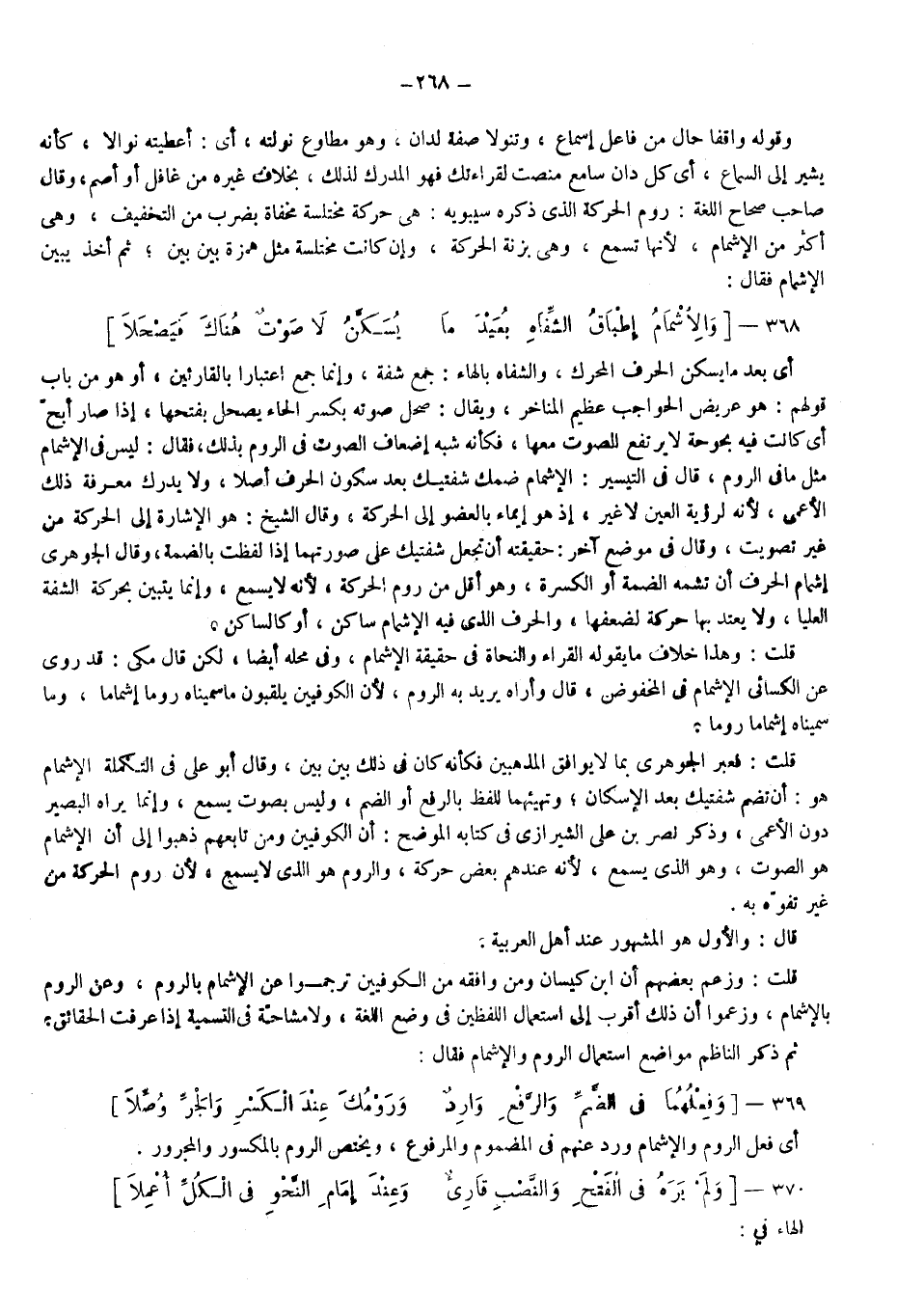 وقوله: واقفا حال من فاعل إسماع، وتنولا صفة لدانٍ، وهو مطاوع نولته أي أعطيته نوالا كأنه يشير إلى السماع أي كل دانٍ سامع منصت لقراءتك، فهو المدرك لذلك بخلاف غيره من غافل أو أصم، وقال صاحب صحاح اللغة: روم الحركة الذي ذكره سيبويه هي حركة مختلسة مخفاة بضرب من التخفيف، وهي أكثر من الإشمام؛ لأنها تسمع وهي بزنة الحركة، وإن كانت مختلسة مثل همزة بين بين ثم أخذ يبين الإشمام فقال: