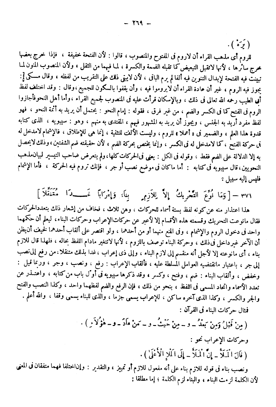 {يَرَهُ} ، للروم أي مذهب القراء أن لا روم في المفتوح والمنصوب، قالوا: لأن الفتحة خفيفة فإذا خرج بعضها خرج سائرها؛ لأنها لا تقبل التبعيض كما تقبله الضمة والكسرة؛ لما فيهما من الثقل، ولأن المنصوب المنون لما تبينت فيه الفتحة؛ لإبدال التنوين فيه ألفا لم يرم الباقي؛ لأن لا يبقى ذلك على التقريب من لفظه وقال مكي يجوز فيه الروم غير أن عادة القراء أن لا يروموا فيه، وأن يقفوا بالسكون للجميع وقال: وقد اختلف لفظ أبي الطيب -رحمه الله- تعالى في ذلك وبالإسكان قرأت عليه في المنصوب لجميع القراء، وأما أهل النحو فأجازوا الروم في الفتح كما في الكسر والضم من غير فرق، فقوله: إمام النحو: يحتمل أن يريد به أئمة النحو فهو لفظ مفرد أريد به الجنس، ويجوز أن يريد به المشهور فيهم المقتدى به منهم وهو سيبويه الذي كتابه قدوة هذا العلم، والضمير في "أعملا" للروم، وليست الألف للتثنية إنما هي للإطلاق فالإشمام لا مدخل له في حركة الفتح كما لا مدخل له في الكسر، وإنما يختص بحركة الضم؛ لأن حقيقته ضم الشفتين، وذلك لا يحصل به إلا الدلالة على الضم فقط، وقوله: في الكل يعني في الحركات كلها ولم يتعرض صاحب التيسير لبيان مذهب النحويين، قال سيبويه في كتابه: أما ما كان في موضع نصب أو جر فإنك تروم فيه الحركة فأما الإشمام فليس إليه سبيل.
