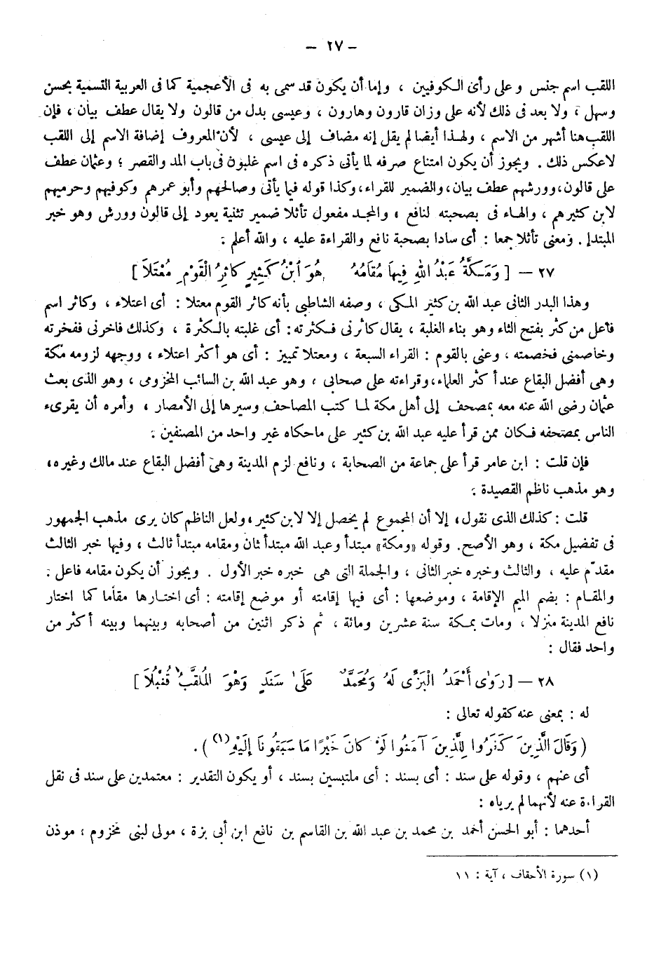 وهذا البدر الثاني عبد الله بن كثير المكي وصفة الشاطبي بأنه كاثر القوم معتلا: أي اعتلاء وكاثر اسم فاعل من كثر بفتح الثاء وهو بناء الغلبة يقال كاثرني فكثرته أي غلبته بالكثرة وكذلك فاخرني ففخرته وخاصمني فخصمته، وعنى بالقوم: القراء السبعة، ومعتلا تمييز: أي هو أكثر اعتلاء ووجهه لزومه مكة وهي أفضل البقاع عند أكثر العلماء وقراءته على صحابي وهو عبد الله بن السائب المخزومي وهو الذي بعث عثمان -رضي الله عنه- معه بمصح إلى أهل مكة لما كتب المصاحف وسيرها إلى الأمصار، وأمره أن يقرئ الناس بمصحفه، فكان ممن قرأ عليه عبد الله بن كثير على ما حكاه غير واحد من المصنفين.