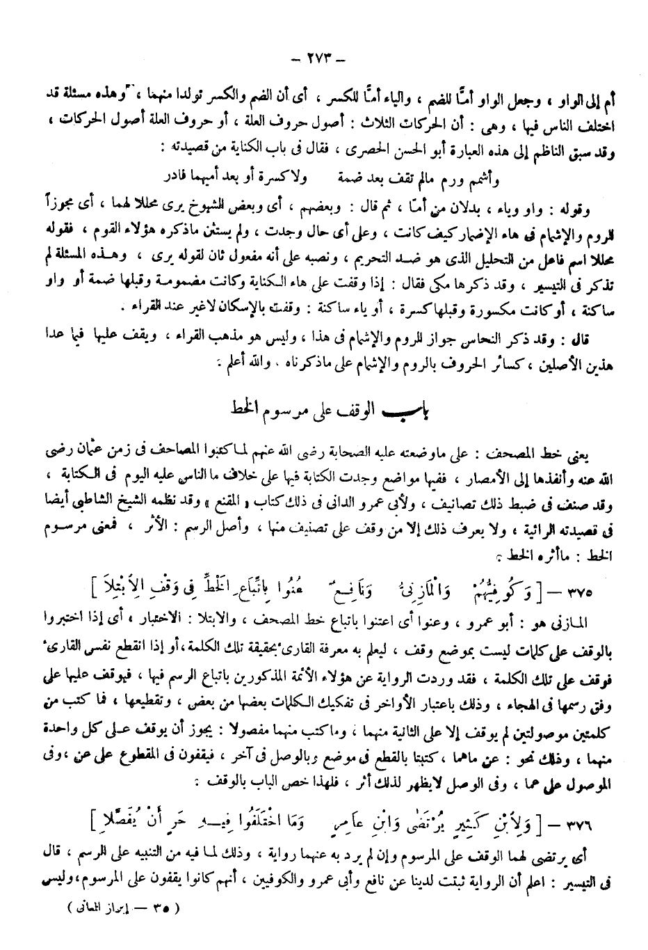 المازني هو: أبو عمرو، وعنوا أي اعتنوا باتباع خط المصحف، والابتلا الاختبار أي إذا اختبروا بالوقف على كلمات ليست بموضع وقف؛ ليعلم به معرفة القارئ بحقيقة تلك الكلمة أو إذا انقطع نفس القارئ فوقف على تلك الكلمة، فقد وردت الرواية عن هؤلاء الأئمة المذكورين باتباع الرسم فيها، فيوقف عليها على وفق رسمها في الهجاء، وذلك باعتبار الأواخر في تفكيك الكلمات بعضها من بعض وتقطيعها، فما كتب من كلمتين موصولتين لم يوقف إلا على الثانية منهما، وما كتب منهما مفصولا يجوز أن يوقف على كل واحدة منهما، وذلك نحو: "عن ما"؛ هما كتبتا بالقطع في موضع وبالوصل في آخر فيقفون في المقطوع على "عن"، وفي الموصول على "عما"، وفي الوصل لا يظهر لذلك أثر فلهذا خص الباب بالوقف.