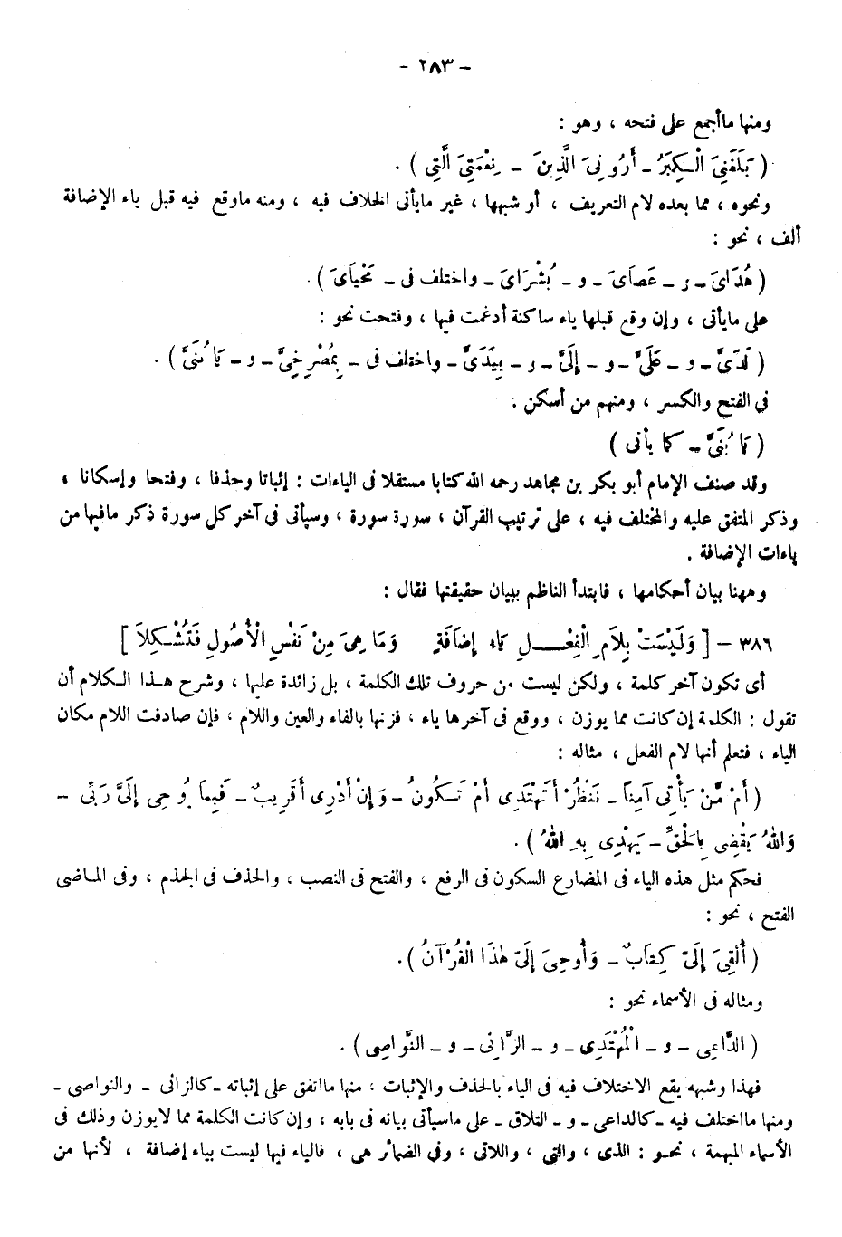 فهذا وشبهه يقع الاختلاف فيه في الياء بالحذف والإثبات منا ما اتفق على إثباته "كالزاني" و"النواصي"، ومنها ما اختلف فيه "كالداعي" و"التلاق" على ما سيأتي بيانه في بابه وإن كانت الكلمة مما لا يوزن وذلك في الأسماء المبهمة نحو الذي والتي واللاتي، وفي الضمائر هي فالياء فيها ليست بياء إضافة؛ لأنها من