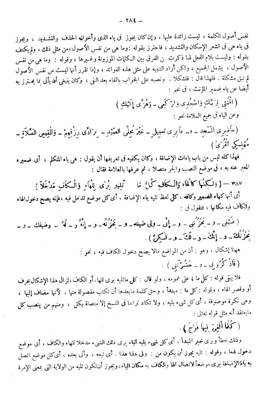 فلا يبقى قوله: "كل ما" على عمومه، ولو قال: كل ما تليه يرى للها أو الكاف لزال هذا الإشكال بحرف أو وقصر الهاء، وقوله: "كل ما" مبتدأ وحق كلمة "ما" بعدها أن تكتب مفصولة منها؛ لأنها مضاف إليها وهي نكرة موصوفة أي كل شيء يليه ولا تكاد تراها في النسخ إلا متصلة بكل ومنهم من ينصب كل ما يعتقد أنه مثل قوله تعالى: {كُلَّمَا أُلْقِيَ فِيهَا فَوْجٌ} ، وذلك خطأ، ويرى خبر المبتدأ أي كل شيء يليه الياء يرى ذلك الشيء مدخلا للهاء والكاف أي موضع دخول لهما وقوله: تليه يجوز أن يكون من ولى هذا هذا أي تبعه وأتى بعده أي كل موضع اتصل به ياء الإضافة يرى موضعا لاتصال الهاء والكاف به مكان الياء، ويجوز أن تكون تليه من الولاية التي بمعنى الإمرة