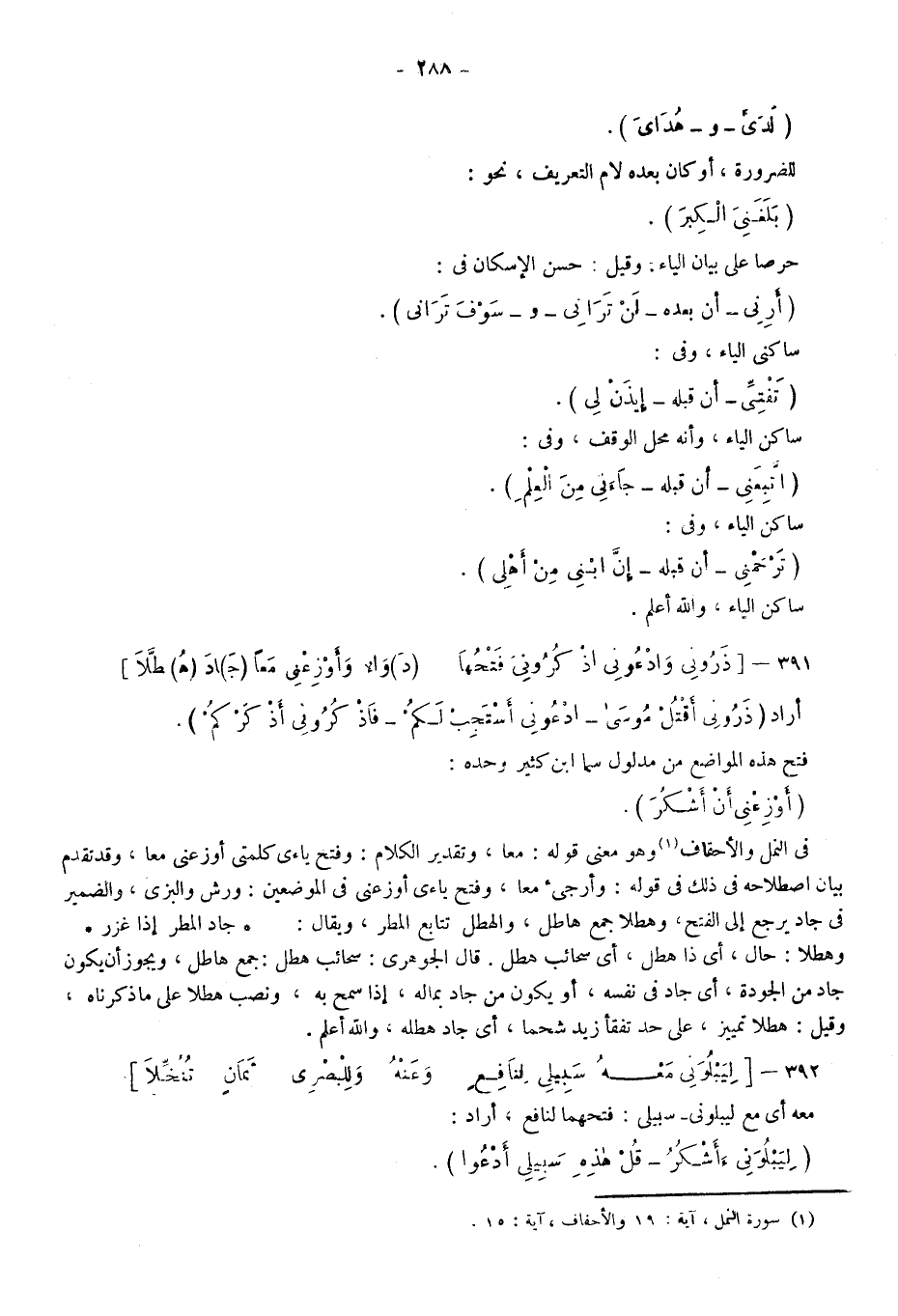 أراد: {ذَرُونِي أَقْتُلْ مُوسَى} ، {ادْعُونِي أَسْتَجِبْ لَكُمْ} ، {فَاذْكُرُونِي أَذْكُرْكُمْ} فتح هذه المواضع من مدلول سما ابن كثير وحده: {أَوْزِعْنِي أَنْ أَشْكُرَ} في النمل والأحقاف1، وهو معنى قوله: معا، وتقدير الكلام: وفتح ياءي كلمتي: أوزعني معا، وقد تقدم بيان اصطلاحه في ذلك في قوله: وأرجئ معا، وفتح ياءي أوزعني في الموضعين: ورش والبزي والضمير في جاد يرجع إلى الفتح وهطلا جمع هاطل، والهطل تتابع المطر ويقال: جاد المطر إذا غزر، وهطلا: حال أي ذا هطل أي سحائب هطل، قال الجوهري: سحائب هطل: جمع هاطل ويجوز أن يكون جاد من الجودة أي جاد في نفسه أو يكون من جاد بماله إذا سمح به ونصب هطلا على ما ذكرناه وقيل هطلا تمييز على حد تفقأ زيد شحما أي جاد هطله والله أعلم.