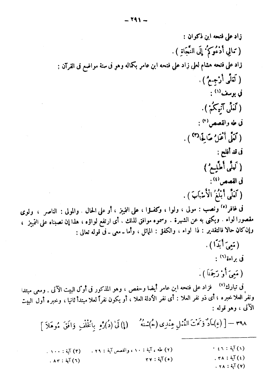 ونصب: مولى ولوا وكفؤا على التمييز أو على الحال، والمولى: الناصر ولوى مقصور لواء، ويكنى به عن الشهرة وسموه موافق لذلك أي ارتفع لواؤه؛ هذا إن نصبناه على التمييز، وإن كان حالا فالتقدير: ذا لواء والكفؤ: المماثل، وأما "معي" في قوله تعالى: {مَعِيَ أَبَدًا} في براءة6، {مَعِيَ أَوْ رَحِمَنَا} في تبارك7، فزاد على فتحه ابن عامر أيضا وحفص وهو المذكور في أول البيت الآتي، ومعي مبتدأ ونفر العلا خبره أي ذو نفر العلا أي نفر الأدلة العلا أو يكون نفر العلا مبتدأ ثانيا وخبره أول البيت الآتي وهو قوله: