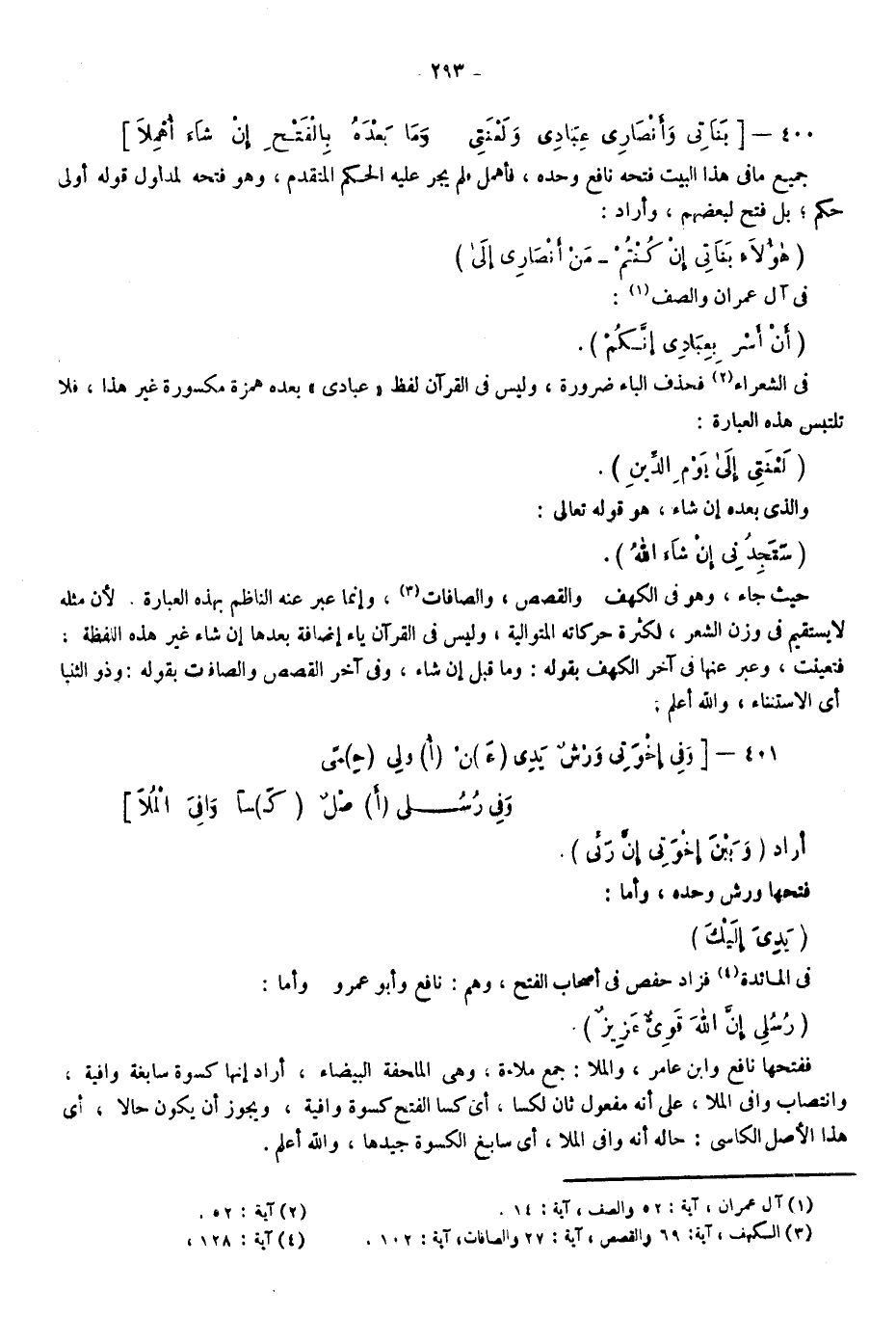 جميع ما في هذا البيت فتحه نافع وحده، فأهمل، فلم يجر عليه الحكم المتقدم، وهو فتحه لمدلول قوله: أولى حكم بل فتح لبعضهم وأراد: {هَؤُلاءِ بَنَاتِي إِنْ كُنْتُمْ} ، {مَنْ أَنْصَارِي إِلَى} في آل عمران والصف1، {أَنْ أَسْرِ بِعِبَادِي إِنَّكُمْ} في الشعراء2، فحذف الباء ضرورة، وليس في القرآن لفظ "عبادي" بعده همزة مكسورة غير هذا فلا تلتبس هذه العبارة: {لَعْنَتِي إِلَى يَوْمِ الدِّينِ} ، والذي بعده إن شاء هو قوله تعالى: {سَتَجِدُنِي إِنْ شَاءَ اللَّهُ} حيث جاء، وهو في الكهف والقصص والصافات3، وإنما عبر عنه الناظم بهذه العبارة؛ لأن مثله لا يستقيم في وزن الشعر؛ لكثرة حركاته المتوالية، وليس في القرآن ياء إضافة بعدها إن شاء غير هذه اللفظة فتعينت، وعبر عنها في آخر الكهف بقوله: وما قبل إن شاء، وفي آخر القصص والصافات بقوله: وذو الثنيا أي الاستثناء والله أعلم.