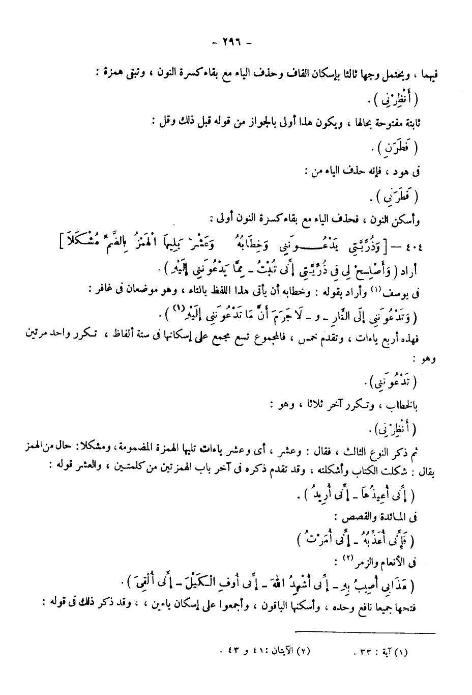 فيهما ويحتمل وجهًا ثالثًا بإسكان القاف وحذف الياء مع بقاء كسرة النون وتبقى همزة: "أَنْظِرْنِي" ثابتة مفتوحة بحالها، ويكون هذا أولى بالجواز من قوله قبل ذلك وقل: "فطرن" في هود فإنه حذف الياء من: "فَطَرَنِي" وأسكن النون فحذف الياء مع بقاء كسرة النون أولى.