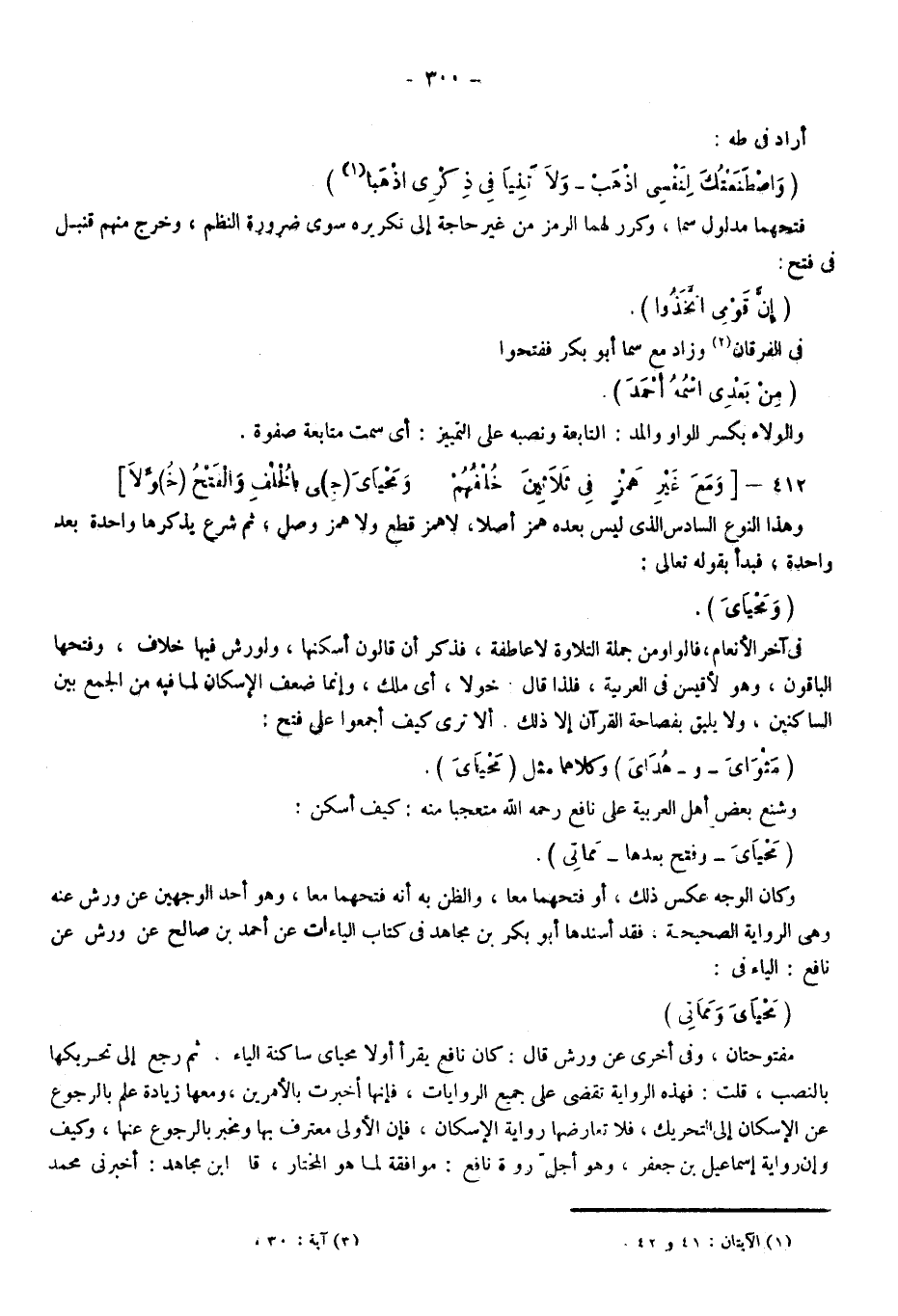 وشنع بعض أهل العربية على نافع -رحمه الله- متعجبا منه: كيف أسكن: "مَحْيَايَ"، وفتح بعدها: "مَمَاتِي"، وكان الوجه عكس ذلك أو فتحهما معا، والظن به أنه فتحهما معا، وهو أحد الوجهين عن ورش عنه، وهي الرواية الصحيحة فقد أسندها أبو بكر بن مجاهد في كتاب الياءات عن أحمد بن صالح عن ورش عن نافع: الياء في: "مَحْيَايَ وَمَمَاتِي" مفتوحتان، وفي أخرى عن ورش قال: كان نافع يقرأ أولا محياي ساكنة الياء، ثم رجع إلى تحريكها بالنصب. قلتُ: فهذه الرواية تقضي على جميع الروايات؛ فإنها أخبرت بالأمرين، ومعها زيادة علم بالرجوع عن الإسكان إلى التحريك فلا تعارضها رواية الإسكان؛ فإن الأولى معترف بها، ومخبر بالرجوع عنها، وكيف وإن رواية إسماعيل بن جعفر وهو أجل رواة نافع: موافقة لما هو المختار، قال ابن مجاهد: أخبرني محمد