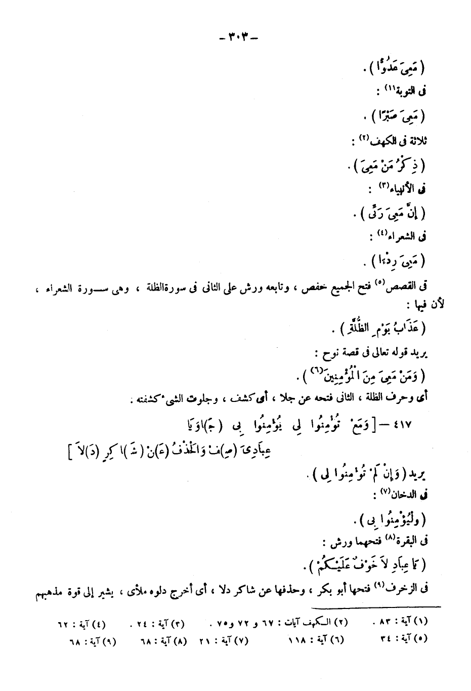 يريد: {وَإِنْ لَمْ تُؤْمِنُوا لِي} في الدخان7، {وَلْيُؤْمِنُوا بِي} في البقرة8 فتحهما ورش، {يَا عِبَادِ لا خَوْفٌ عَلَيْكُمُ} في الزخرف9، فتحها أبو بكر وحذفها عن شاكر دلا أي أخرج دلوه ملأى يشير إلى قوة مذهبهم