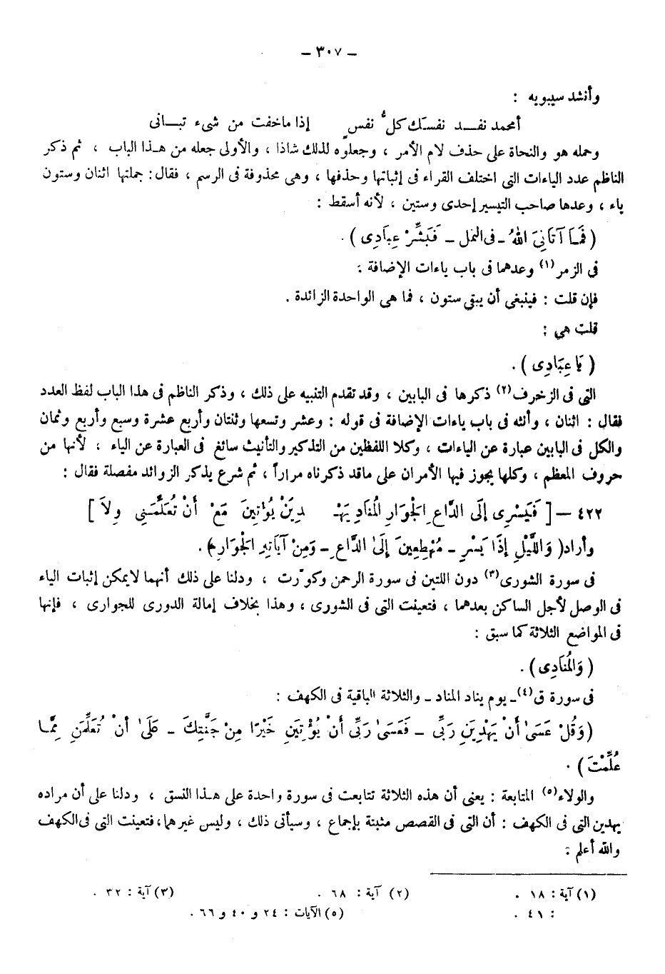 وأراد: {وَاللَّيْلِ إِذَا يَسْرِ} ، {مُهْطِعِينَ إِلَى الدَّاعِ} ، {وَمِنْ آيَاتِهِ الْجَوَارِ} في سورة الشورى3، دون اللتين في سورة الرحمن وكورت، ودلنا على ذلك أنهما لا يمكن إثبات الياء في الوصل لأجل الساكن بعدهما فتعينت التي في الشورى وهذا بخلاف إمالة الدوري للجواري فإنها في المواضع الثلاثة كما سبق: "والمنادي" في سورة ق4 {يَوْمَ يُنَادِ الْمُنَادِ} ، والثلاثة الباقية في الكهف: {وَقُلْ عَسَى أَنْ يَهْدِيَنِ رَبِّي} ، {فَعَسَى رَبِّي أَنْ يُؤْتِيَنِ خَيْرًا مِنْ جَنَّتِكَ} ، {عَلَى أَنْ تُعَلِّمَنِ مِمَّا عُلِّمْتَ} .