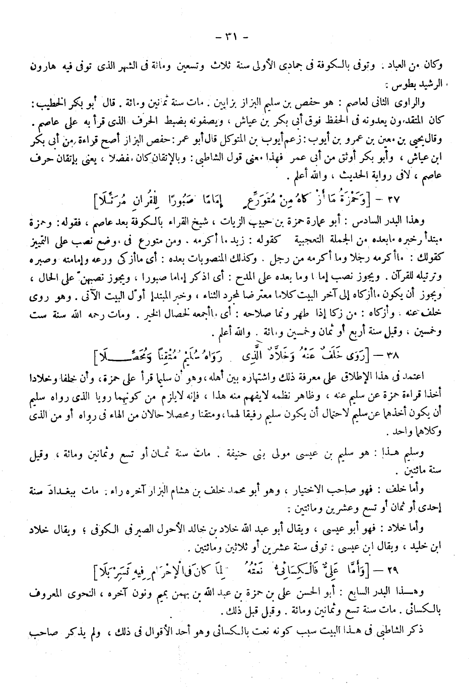 وهذا البدر السادس: أبو عمارة حمزة بن حبيب الزيات شيخ القراء بالكوفة بعد عاصم فقوله: وحمزة مبتدأ وخبره ما بعده من الجملة التعجبية، كقوله: زيد ما أكرمه، ومن متورع في موضع نصب على التمييز كقولك: ما أكرمه رجلا وما أكرمه من رجل، وكذلك المنصوبات بعده أي ما أزكى ورعه وإمامته وصبره وترتيله للقرآن، ويجوز نصب إماما وما بعده على المدح أي اذكر إماما صبورا ويجوز نصبهنّ على الحال ويجوز أن يكون ما أزكاه إلى آخر البيت كلاما معترضا لمجرد الثناء، وخبر المبتدأ أول البيت الآتي، وهو: "روى خلف عنه وأزكاه من زكا" إذا طهر ونما صلاحه أي ما أجمعه لخصال الخير، ومات -رحمه الله- سنة ست ومسين وقيل سنة أربع أو ثمان وخمسين ومائة والله أعلم.