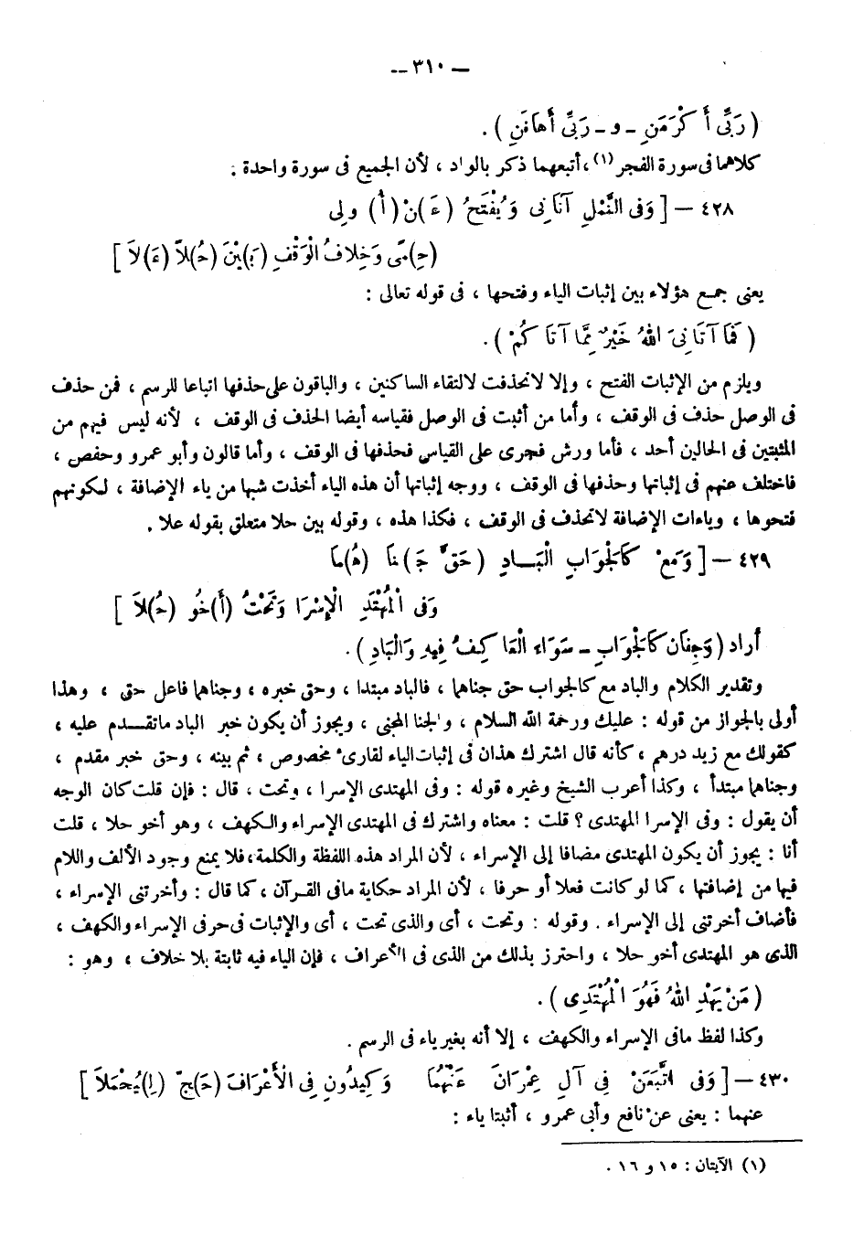 ويلزم من الإثبات الفتح وإلا لانحذفت لالتقاء الساكنين والباقون على حذفها اتباعا للرسم فمن حذف في الوصل حذف في الوقف وأما من أثبت في الوصل فقياسه أيضا الحذف في الوقف؛ لأنه ليس فيهم من المثبتين في الحالين أحد، فأما ورش فجرى على القياس فحذفها في الوقف، وأما قالون وأبو عمرو وحفص فاختلف عنهم في إثباتها وحذفها في الوقف، ووجه إثباتها أن هذه الياء أخذت شبها من ياء الإضافة؛ لكونهم فتحوها وياءات الإضافة لا تحذف في الوقف فكذا هذه، وقوله: بين حلا متعلق بقوله علا.