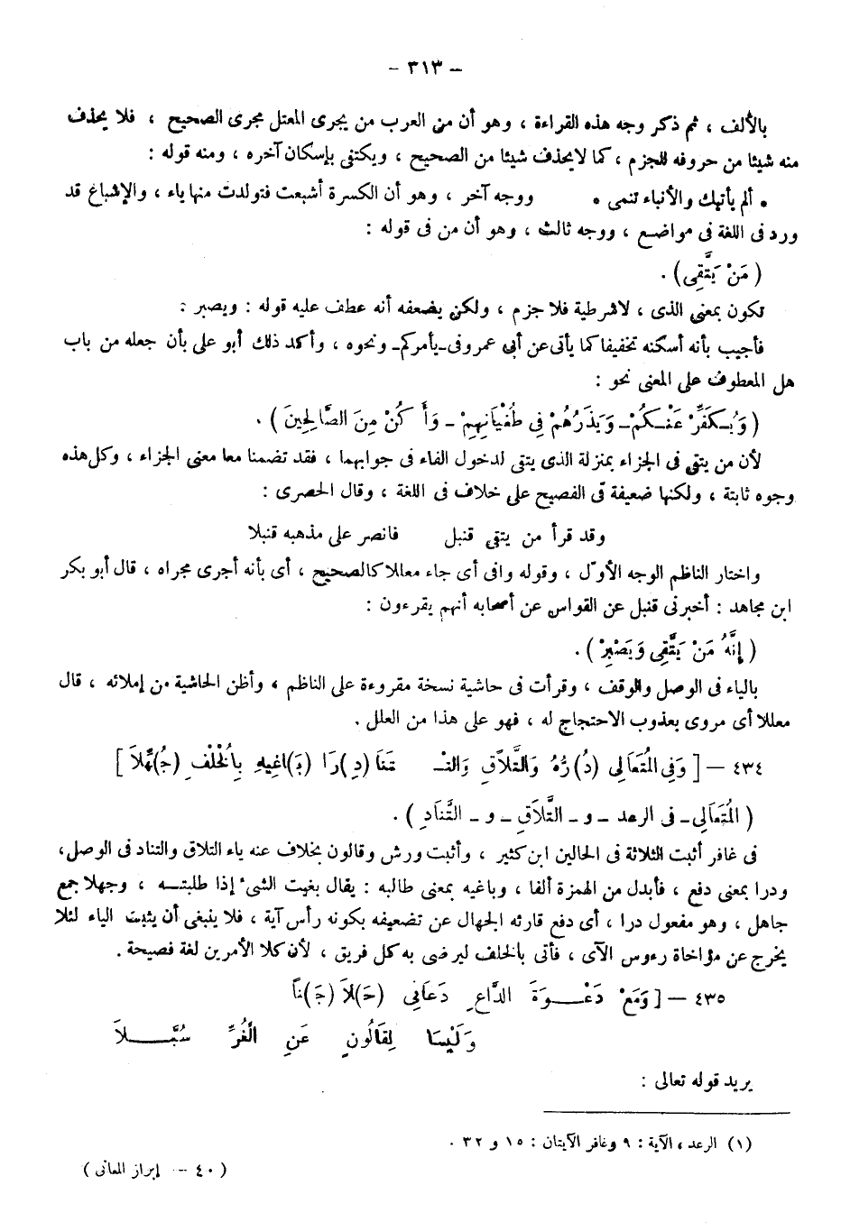 "المتعالى" في الرعد و"التَّلاقِ"، و"التَّنَادِ" في غافر، أثبت الثلاثة في الحالين ابن كثير، وأثبت ورش وقالون بخلاف عنه ياء التلاق والتناد في الوصل، ودرا بمعنى دفع، فأبدل من الهمزة ألفا، وباغيه بمعنى طالبه يقال بغيت الشيء إذا طلبته، وجهلا جمع جاهل، وهو مفعول درا أي دفع قارئه الجهال عن تضعيفه بكونه رأس آية، فلا ينبغي أن يثبت الياء؛ لئلا يخرج عن مؤاخاة رءوس الآي فأتى بالخلف ليرضى به كل فريق؛ لأن كلا الأمرين لغة فصيحة.
