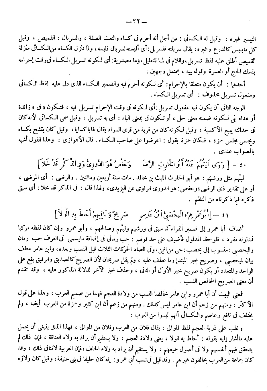 فمعنى البيت أن أبا عمرو وابن عامر خالصا النسب من ولادة العجم فهما من صميم العرب وهذا على قول الأكثر، ومنهم من زعم أن ابن عامر ليس كذلك، ومنهم من زعم أن ابن كثير وحمزة من العرب أيضا ولم يختلف في نافع وعاصم والكسائي أنهم ليسوا من العرب.