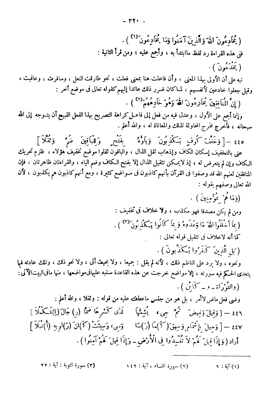 "يخادعون الله والذين آمنوا وما يخادعون"1؛ ففي هذه القراءة رد لفظ ما ابتدأ به وأجمع عليه ومن قرأ الثانية: "يخدعون" نبه على أن الأولى بهذا المعنى، وأن فاعلت هنا بمعنى فعلت نحو طارقت النعل وسافرت وعاقبت وقيل: جعلوا خادعين لأنفسهم لما كان ضرر ذلك عائدا إليهم كقوله تعالى في موضع آخر: {إِنَّ المُنَافِقِينَ يُخَادِعُونَ اللَّهَ وَهُوَ خَادِعُهُمْ} 2، وإنما أجمع على الأول وعدل فيه من فعل إلى فاعل كراهة التصريح بهذا الفعل القبيح أن يتوجه إلى الله سبحانه فأخرج مخرج المحاولة لذلك والمعاناة له والله أعلم.