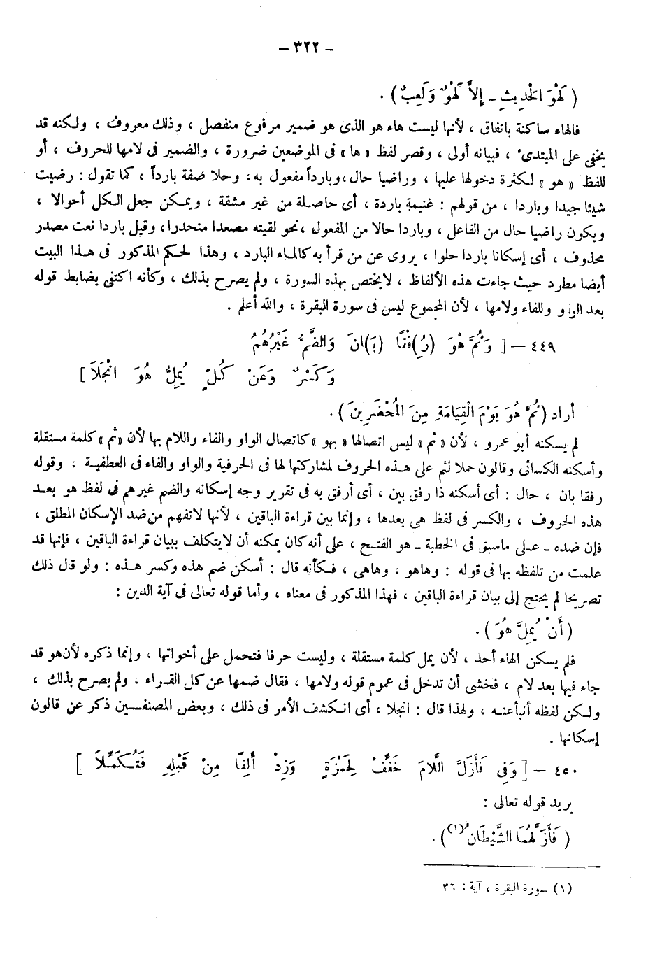 {لَهْوَ الْحَدِيثِ} ، {إِلَّا لَهْوٌ وَلَعِبٌ} فالهاء ساكنة باتفاق؛ لأنها ليست هاء هو الذي هو ضمير مرفوع منفصل، وذلك معروف ولكنه قد يخفى على المبتدئ فبيانه أولى وقصر لفظ "ها" في الموضعين ضرورة، والضمير في لامها للحروف أو للفظ هو؛ لكثرة دخولها عليها وراضيا حال وباردا مفعول به، وحلا صفة باردا كما تقول رضيت شيئا جيدًا وباردًا من قولهم غنيمة باردة أي حاصلة من غير مشقة ويمكن جعل الكل أحوالا ويكون راضيا حال من الفاعل وباردا حالا من المفعول نحو لقيته مصعدا منحدرا وقيل باردا نعت مصدر محذوف إي إسكانا باردا حلوا، يروى عن من قرأ به كالماء البارد، وهذا الحكم المذكور في هذا البيت أيضا مطرد حيث جاءت هذه الألفاظ لا يختص بهذه السورة، ولم يصرح بذلك وكأنه اكتفى بضابط قوله بعد الواو وللفاء ولامها؛ لأن المجموع ليس في سورة البقرة والله أعلم.