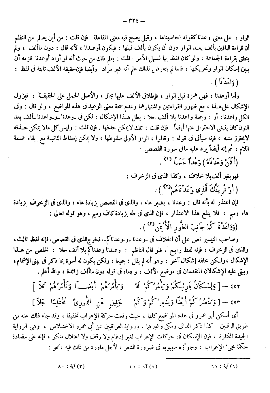 الواو على معنى وعدنا كقوله: "فحاسبناها" وقيل يصح فيه معنى المفاعلة فإن قلت: من أين يعلم من النظم أن قراءة الباقين بألف بعد الواو دون أن يكون بألف قبلها فيكون أوعدنا؛ لأنه قال دون ما ألف ولم ينطق بقراءة الجماعة ولو كان لفظ بها لسهل الأمر قلت: يعلم ذلك من حيث إنه أراد أوعدنا للزمه أن يبين إسكان الواو وتحريكها، فلما لم يتعرض لذلك علم أنه غير مراد وأيضا فإن حقيقة الألف ثابتة في لفظ: {وَاعَدْنَا} ، وأما أوعدنا فهي حمزة قبل الواو فإطلاق الألف عليها مجاز، والأصل الحمل على الحقيقة فيزول الإشكال على هذا مع ظهور القراءتين واشتهارهما وعدم صحة معنى الوعيد في هذه المواضع ولو قال: وفي الكل واعدنا أو وجملة واعدنا بلا ألف حلا بطل هذا الإشكال لكن في "وعدنا" و"واعدنا" ألف بعد النون كان ينبغي الاحتراز عنها أيضا، فإن قلتَ: تلك لا يمكن حذفها، فإن قلت: وليس كل ما لا يمكن حذفه لا يحترز منه فإنه سيأتي في قوله: وقالوا: الواو الأولى سقوطها ولا يمكن إسقاط الثانية مع بقاء ضمة اللام ثم إنه أيضا يرد عليه ما في سورة القصص: {أَفَمَنْ وَعَدْنَاهُ وَعْدًا حَسَنًا} 1.
