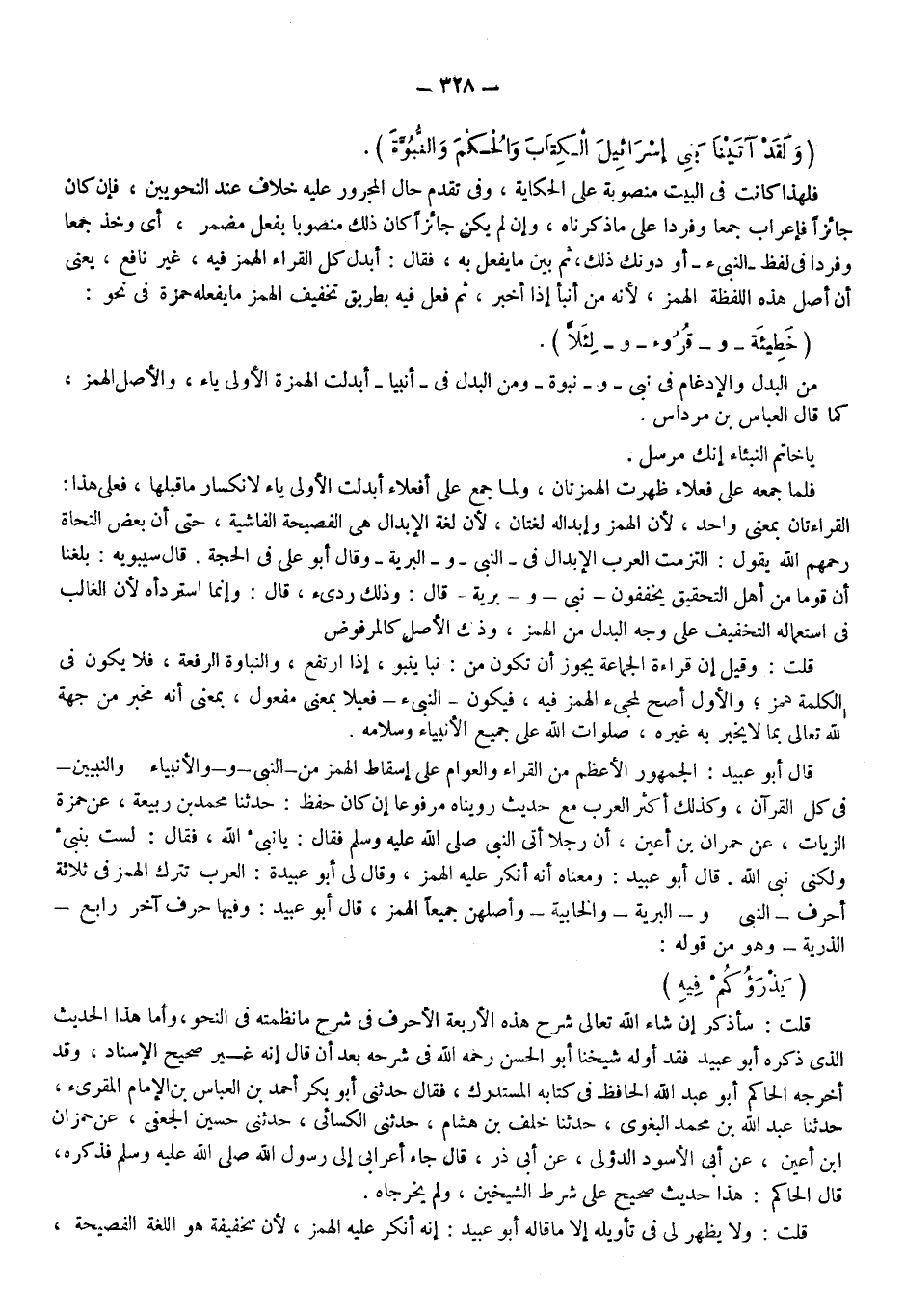 قال أبو عبيد: الجمهور الأعظم من القراء، والعوام على إسقاط الهمز من "النبي" و"الأنبياء" والنبيين في كل القرآن وكذك أكثر العرب مع حديث رويناه مرفوعًا إن كان حفظ: حدثنا محمد بن ربيعة عن حمزة الزيات عن حمران بن أعين أن رجلا أتى النبي -صلى الله عليه وسلم- فقال: يا نبيء الله فقال: "لست بنبيء ولكني نبي الله"، قال أبو عبيد: ومعناه أنه أنكر عليه الهمز، وقال لي أبو عبيدة: العرب تترك الهمز في ثلاثة أحرف: "النبي" و"البرية" والخابية، وأصلهن جميعا الهمز، قال أبو عبيد: وفيها حرف آخر رابع: "الذرية" وهو من قوله: {يَذْرَؤُكُمْ فِيهِ} .