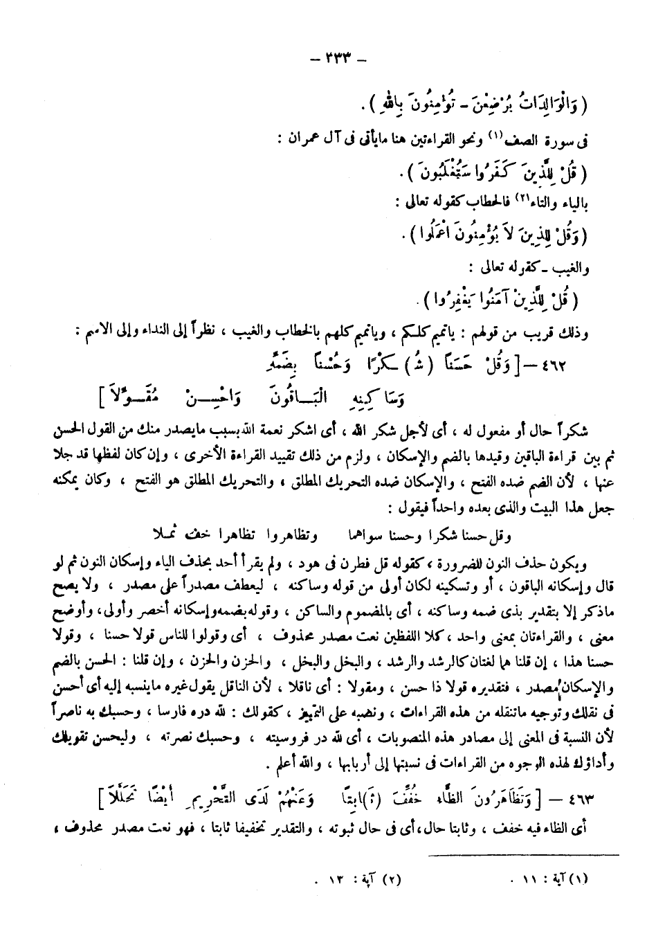 شكرا حال أو مفعول له أي لأجل شكر الله أي اشكر نعمة الله بسبب ما يصدر منك من القول الحسن، ثم بيَّن قراءة الباقين وقيدها بالضم والإسكان، ولزم من ذلك تقييد القراءة الأخرى، وإن كان لفظها قد جلا عنها؛ لأن الضم ضده الفتح والإسكان ضده التحريك المطلق، والتحريك المطلق هو الفتح وكان يمكنه جعل هذا البيت والذي بعده واحدا فيقول:
