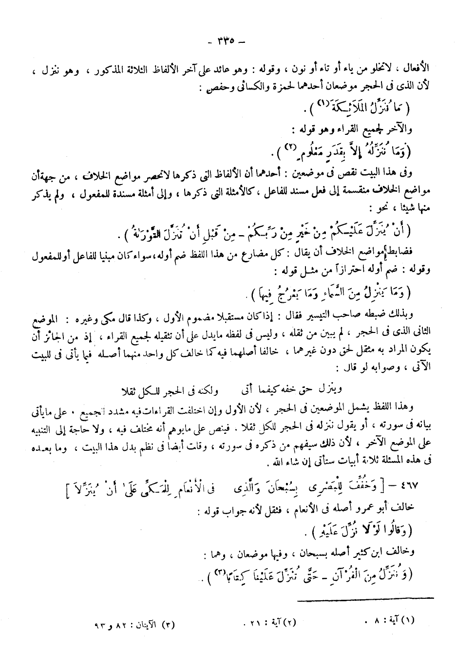 الأفعال لا تخلو من ياء أو تاء أو نون، وقوله وهو عائد على آخر الألفاظ الثلاثة المذكورة وهو ننزل؛ لأن الذي في الحجر موضعان أحدهما لحمزة والكسائي وحفص: {مَا نُنَزِّلُ الْمَلائِكَةَ} 1، والآخر لجميع القراء وهو قوله: {وَمَا نُنَزِّلُهُ إِلَّا بِقَدَرٍ مَعْلُومٍ} 2.